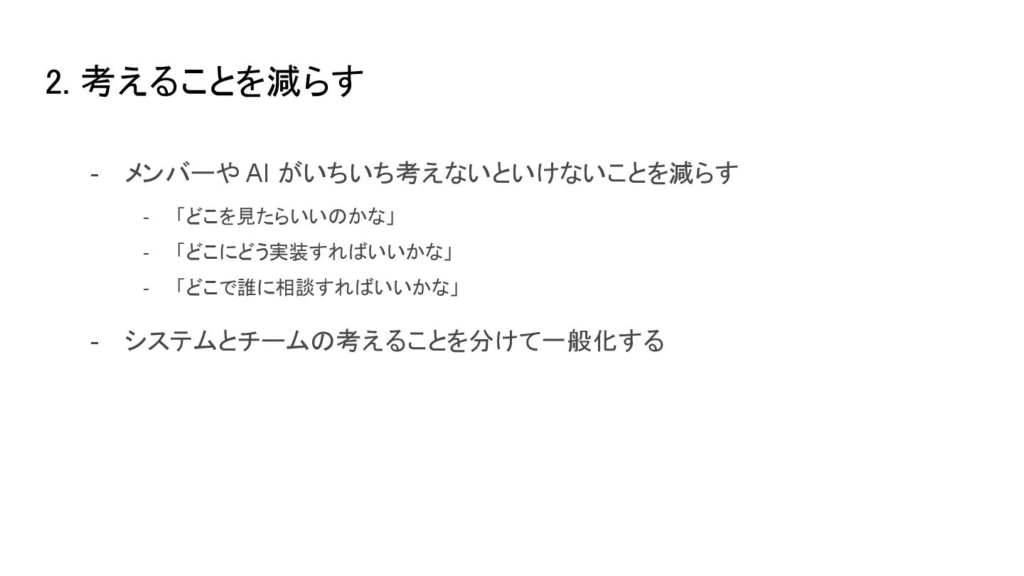 2. 考えることを減らす - メンバーや AI がいちいち考えないといけないことを減らす - 「どこを見たらいいのかな」 - 「どこにどう実装すればいいかな」