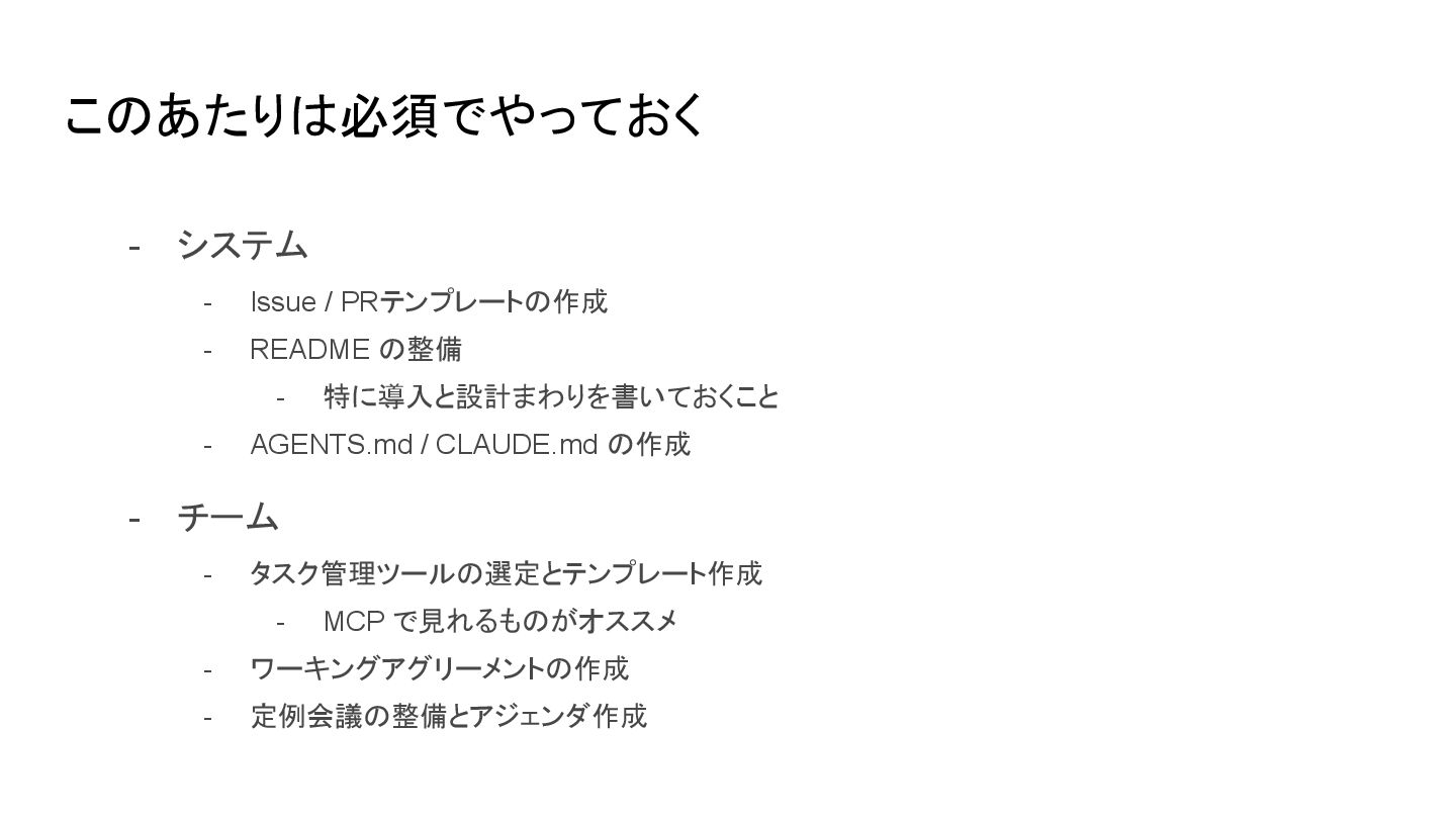 - 特に導入と設計まわりを書いておくこと - AGENTS.md / CLAUDE.md の作成 - チーム - タスク管理ツールの選定とテンプレート作成 - MCP で見れるものがオススメ - ワーキングアグリーメントの作成 - 定例会議の整備とアジェンダ作成
