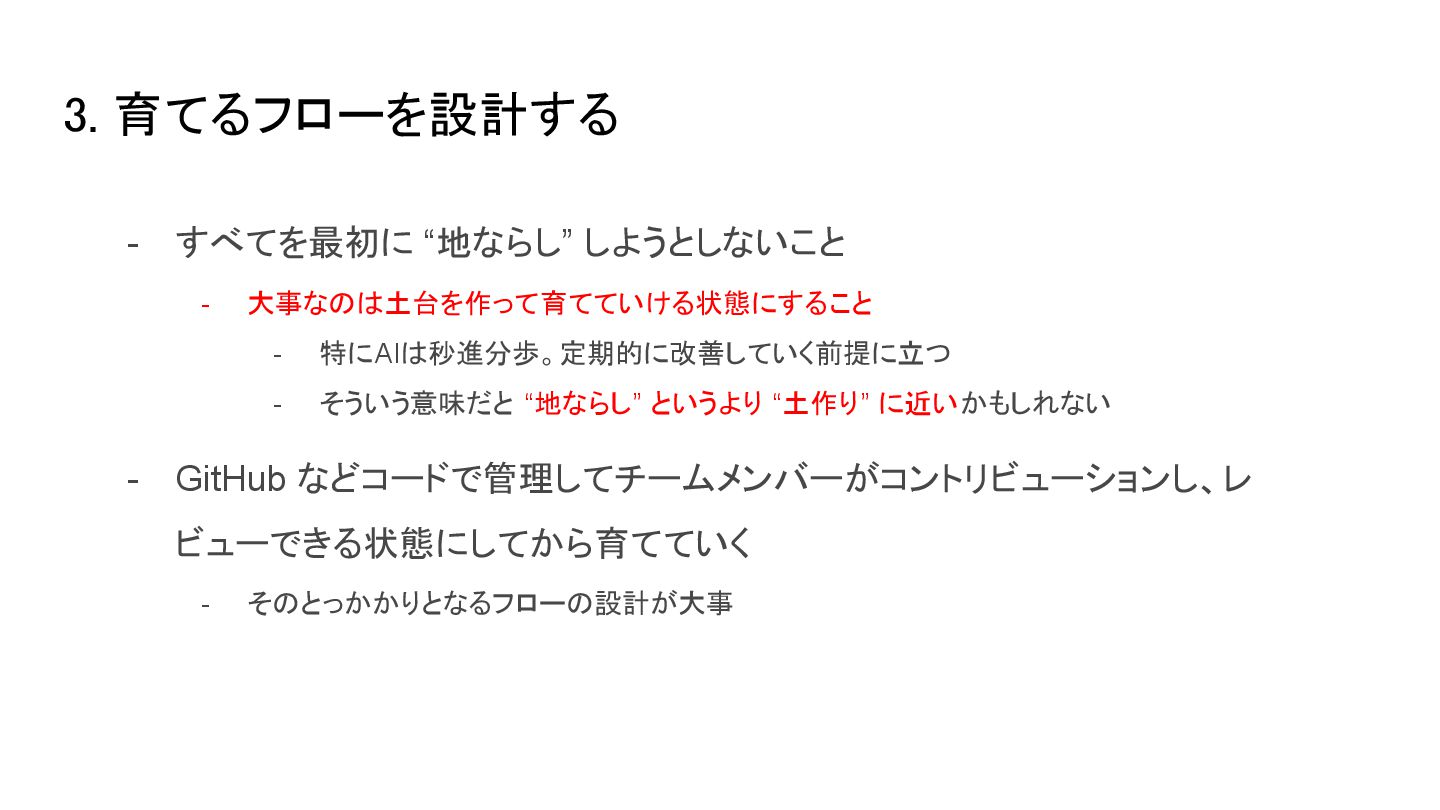 3. 育てるフローを設計する - すべてを最初に “地ならし” しようとしないこと - 大事なのは土台を作って育てていける状態にすること - 特にAIは秒進分歩。定期的に改善していく前提に立つ