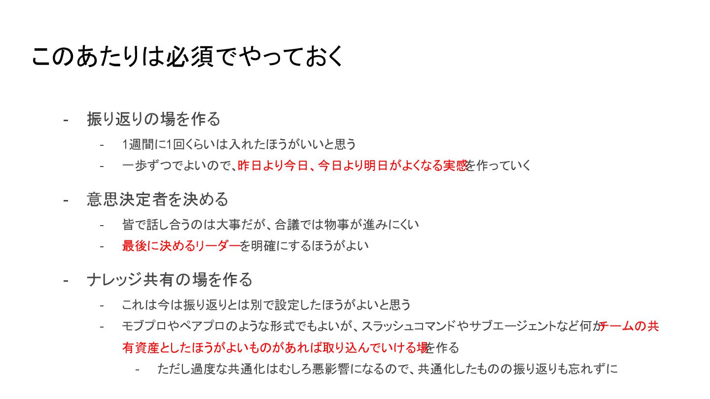 - 皆で話し合うのは大事だが、合議では物事が進みにくい - 最後に決めるリーダーを明確にするほうがよい - ナレッジ共有の場を作る - これは今は振り返りとは別で設定したほうがよいと思う - モブプロやペアプロのような形式でもよいが、スラッシュコマンドやサブエージェントなど何か チームの共 有資産としたほうがよいものがあれば取り込んでいける場 を作る - ただし過度な共通化はむしろ悪影響になるので、共通化したものの振り返りも忘れずに