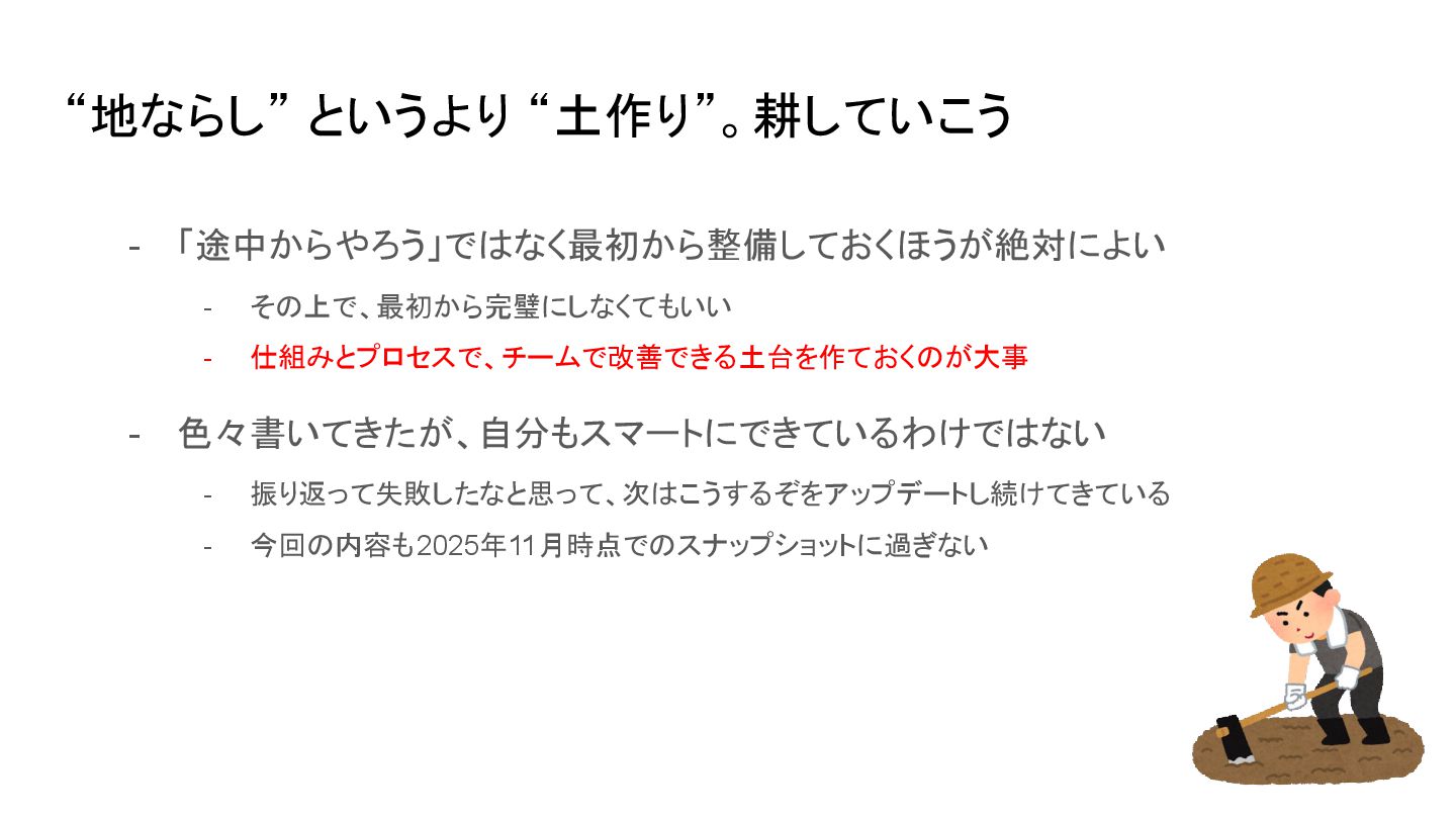“地ならし” というより “土作り”。耕していこう - 「途中からやろう」ではなく最初から整備しておくほうが絶対によい - その上で、最初から完璧にしなくてもいい - 仕組みとプロセスで、チームで改善できる土台を作ておくのが大事 -