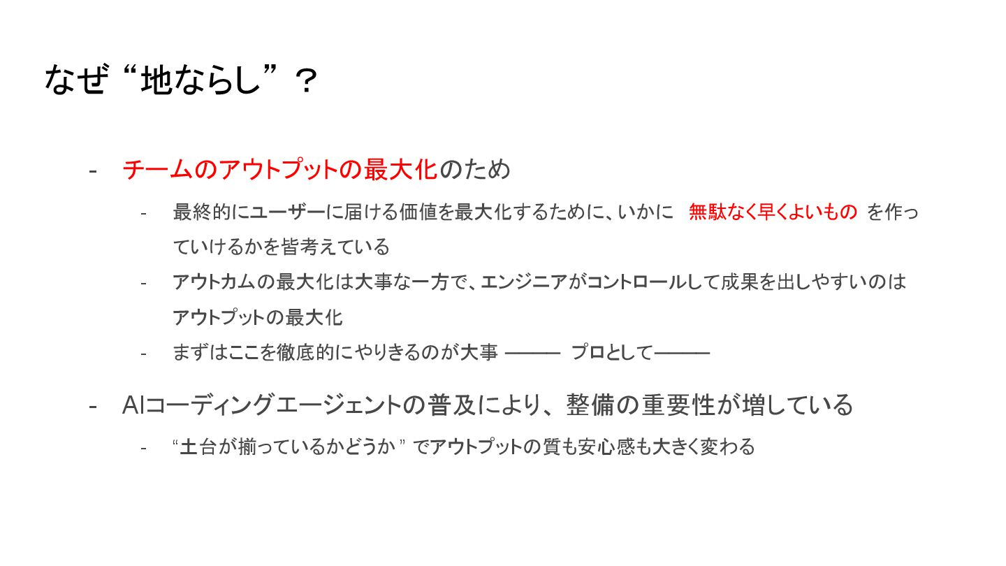 - アウトカムの最大化は大事な一方で、エンジニアがコントロールして成果を出しやすいのは アウトプットの最大化 - まずはここを徹底的にやりきるのが大事 ──── プロとして──── - AIコーディングエージェントの普及により、 整備の重要性が増している - “土台が揃っているかどうか ” でアウトプットの質も安心感も大きく変わる