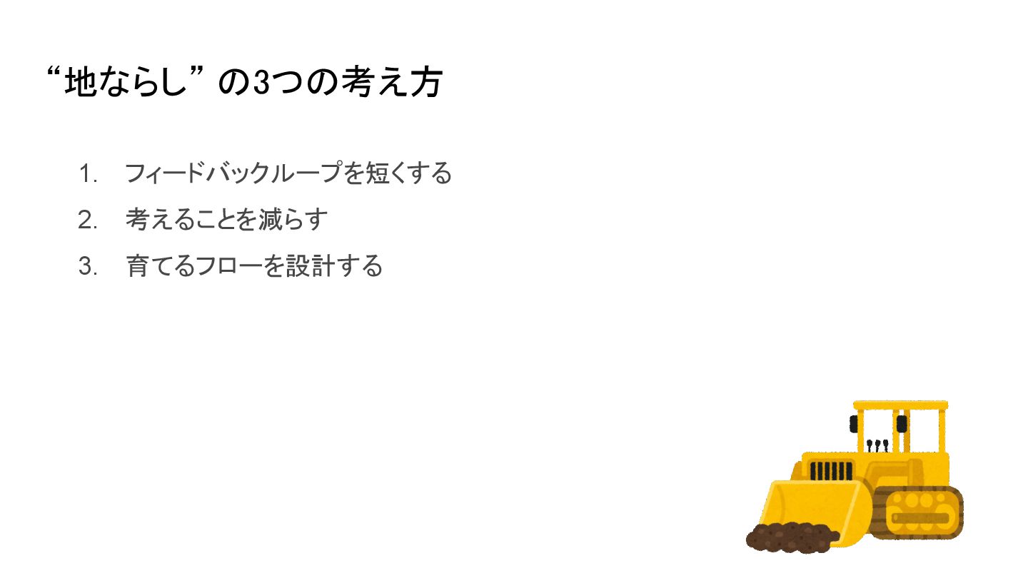 “地ならし” の3つの考え方 1. フィードバックループを短くする 2. 考えることを減らす 3. 育てるフローを設計する