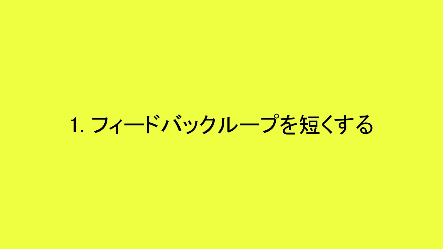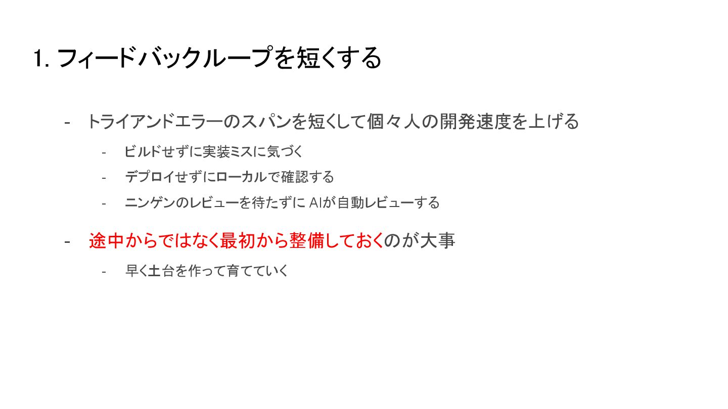 1. フィードバックループを短くする - トライアンドエラーのスパンを短くして個々人の開発速度を上げる - ビルドせずに実装ミスに気づく - デプロイせずにローカルで確認する - ニンゲンのレビューを待たずに