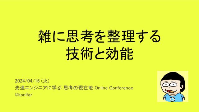 雑に思考を整理する 技術と効能 2024/04/16 (火) 先達エンジニアに学ぶ 思考の現在地 Online Conference @konifar