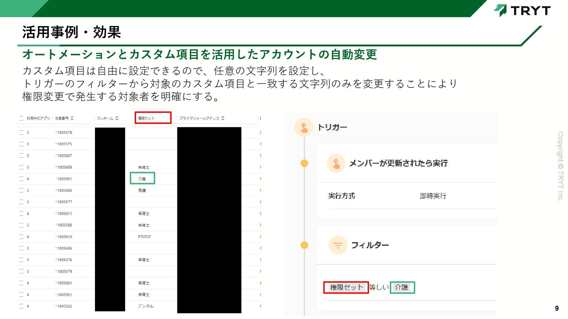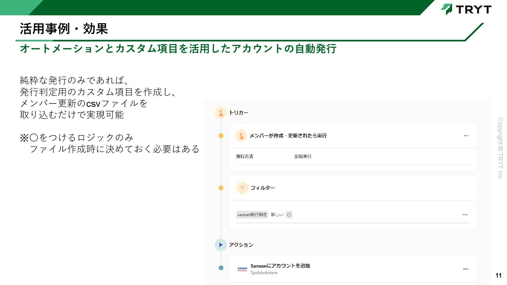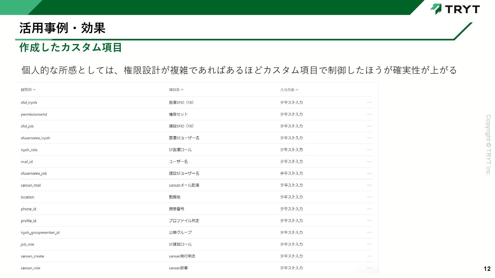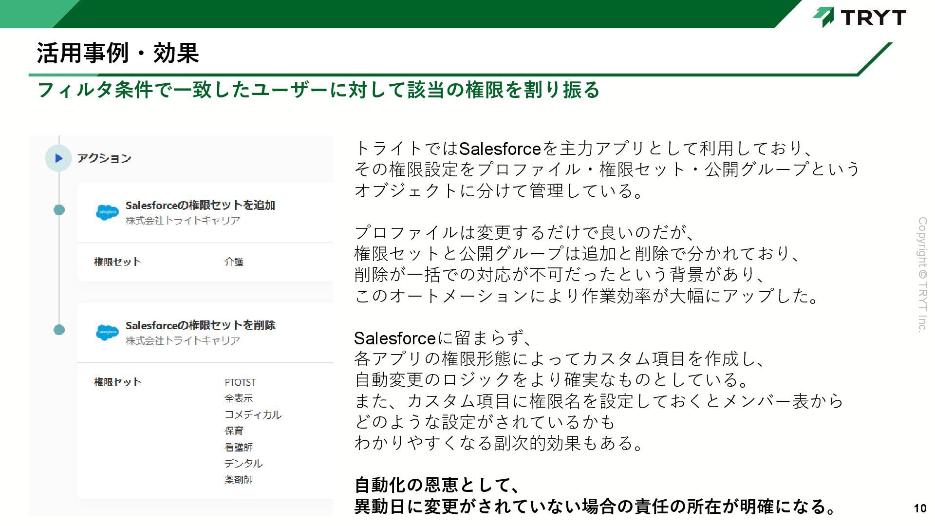 プロファイルは変更するだけで良いのだが、 権限セットと公開グループは追加と削除で分かれており、 削除が一括での対応が不可だったという背景があり、 このオートメーションにより作業効率が大幅にアップした。 Salesforceに留まらず、 各アプリの権限形態によってカスタム項目を作成し、 自動変更のロジックをより確実なものとしている。 また、カスタム項目に権限名を設定しておくとメンバー表から どのような設定がされているかも わかりやすくなる副次的効果もある。 自動化の恩恵として、 異動日に変更がされていない場合の責任の所在が明確になる。