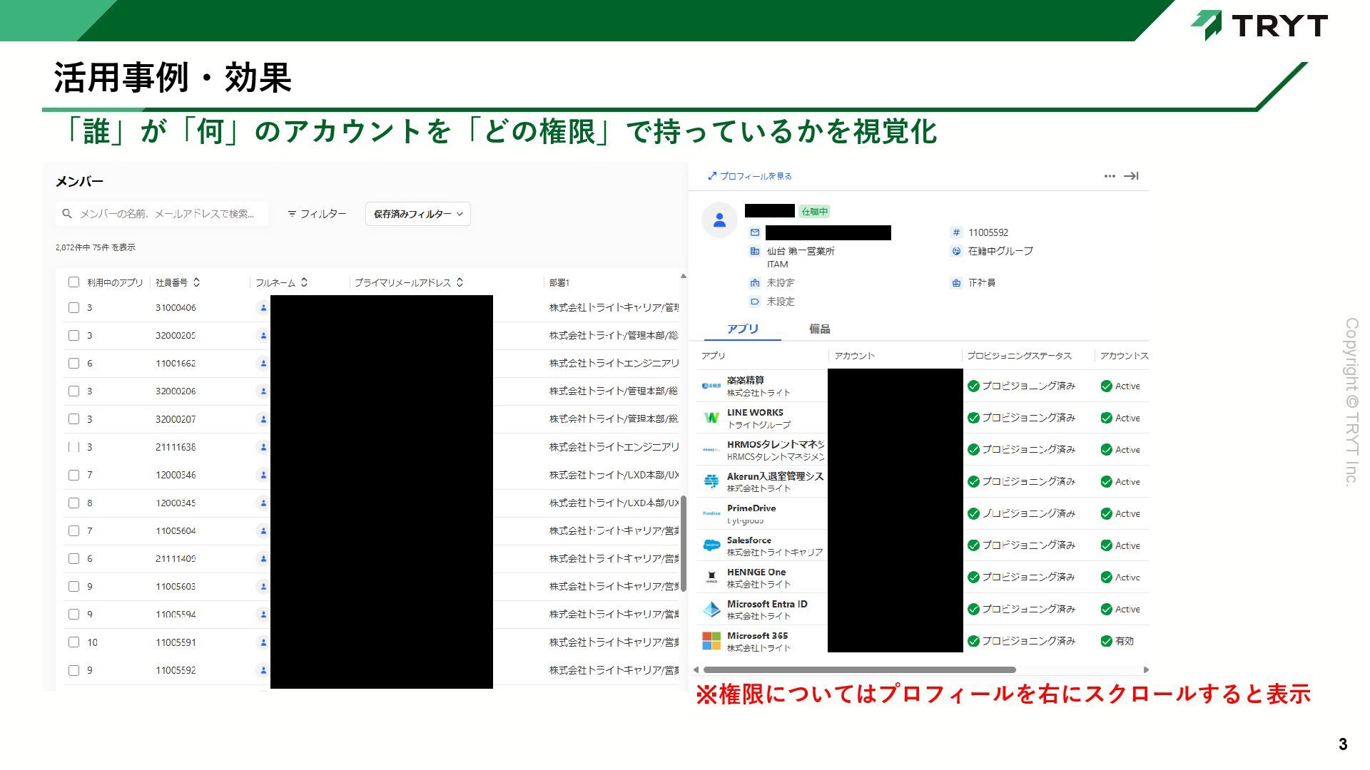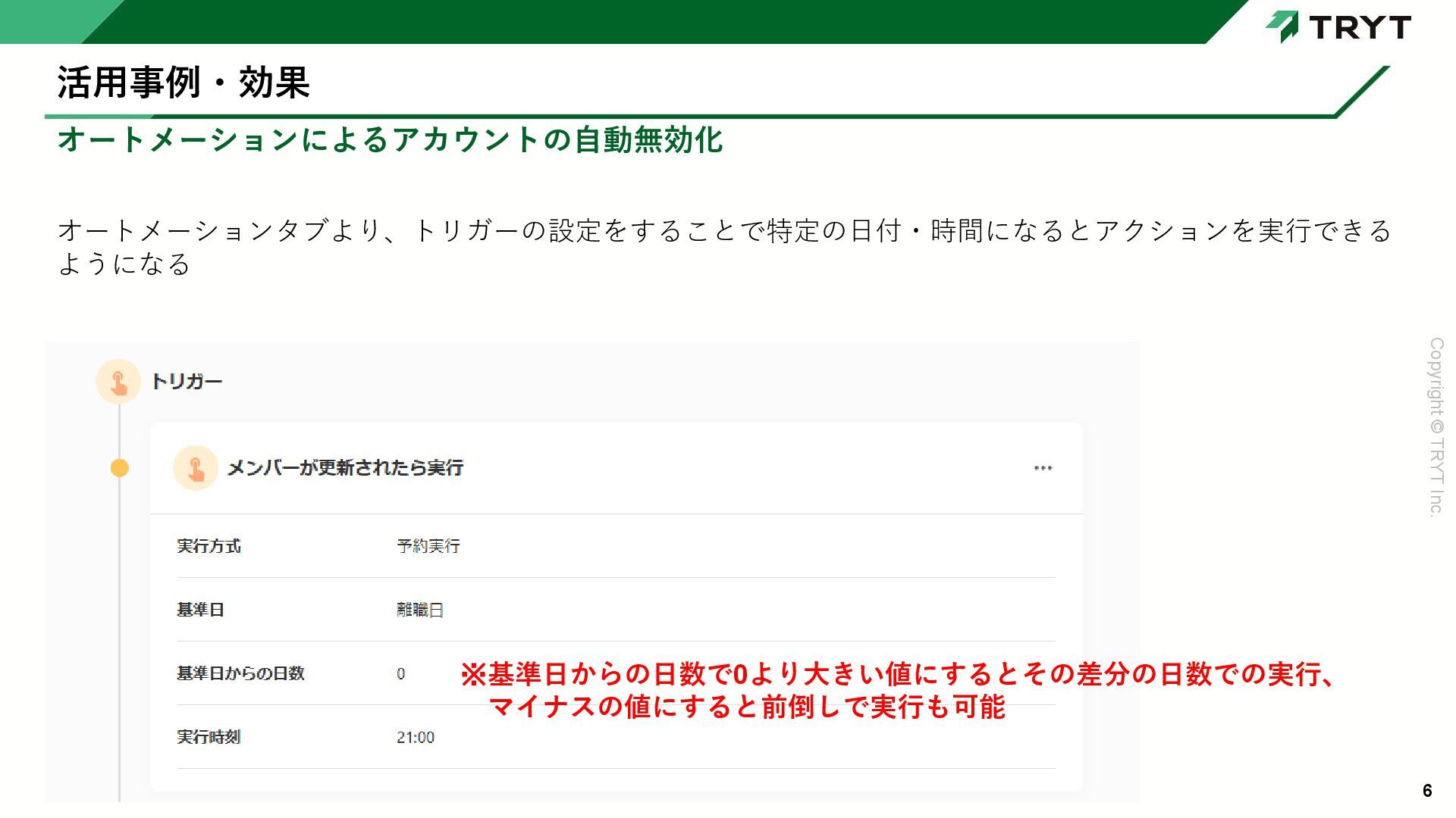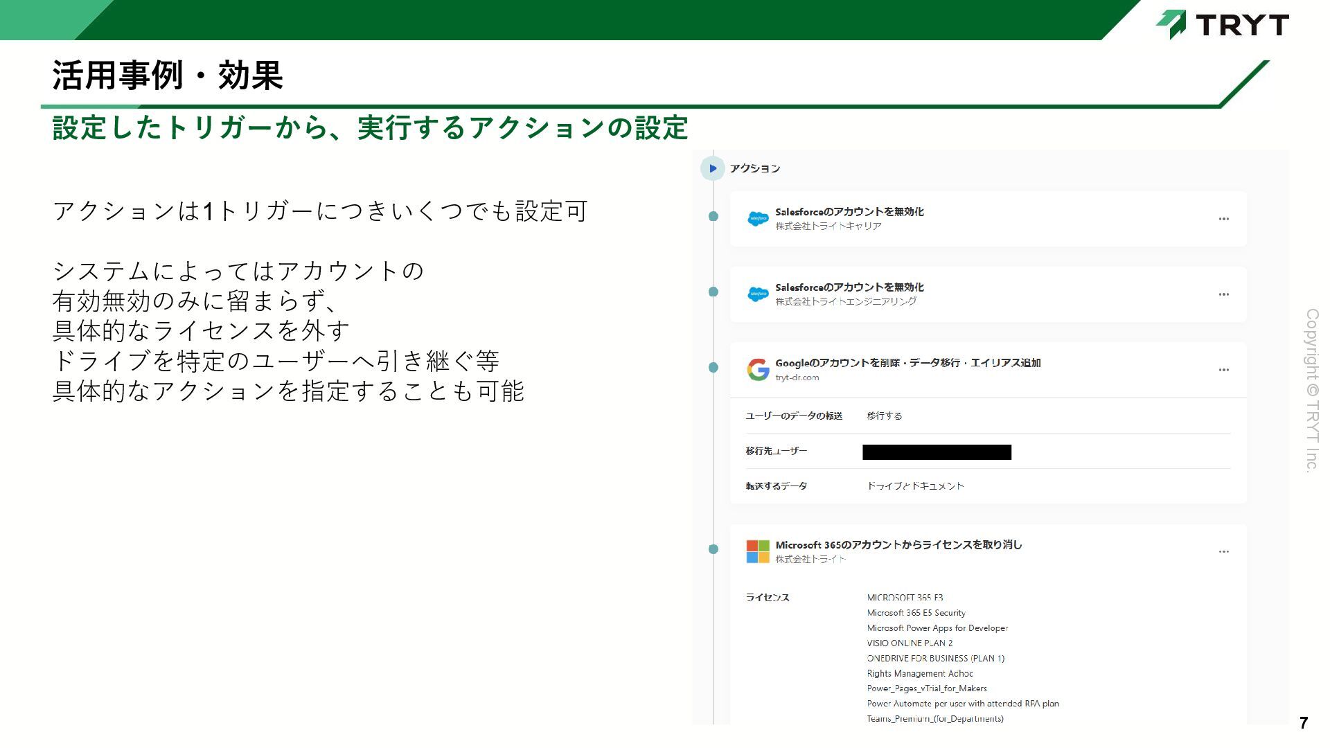 プロファイルは変更するだけで良いのだが、 権限セットと公開グループは追加と削除で分かれており、 削除が一括での対応が不可だったという背景があり、 このオートメーションにより作業効率が大幅にアップした。 Salesforceに留まらず、 各アプリの権限形態によってカスタム項目を作成し、 自動変更のロジックをより確実なものとしている。 また、カスタム項目に権限名を設定しておくとメンバー表から どのような設定がされているかも わかりやすくなる副次的効果もある。 自動化の恩恵として、 異動日に変更がされていない場合の責任の所在が明確になる。