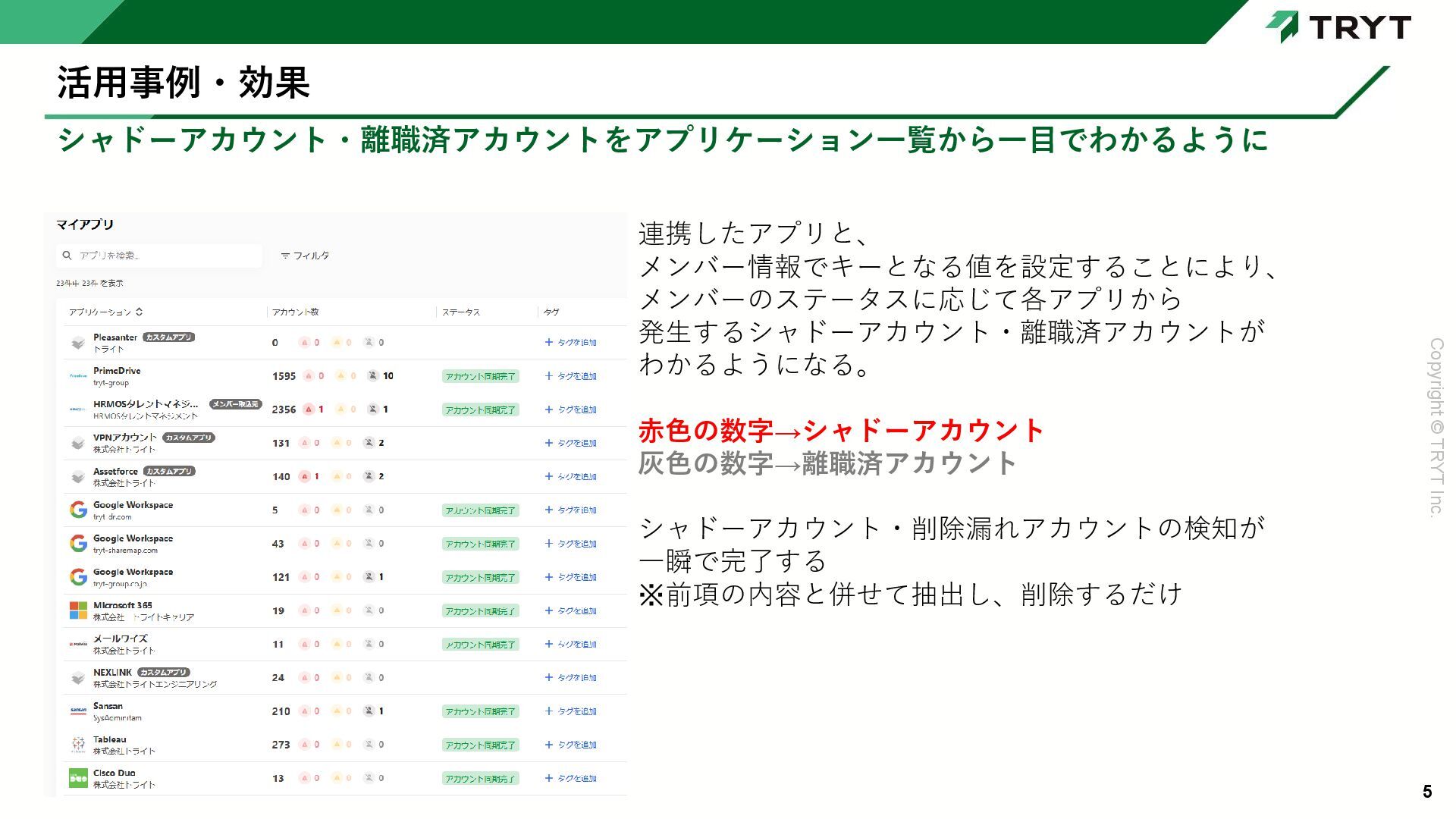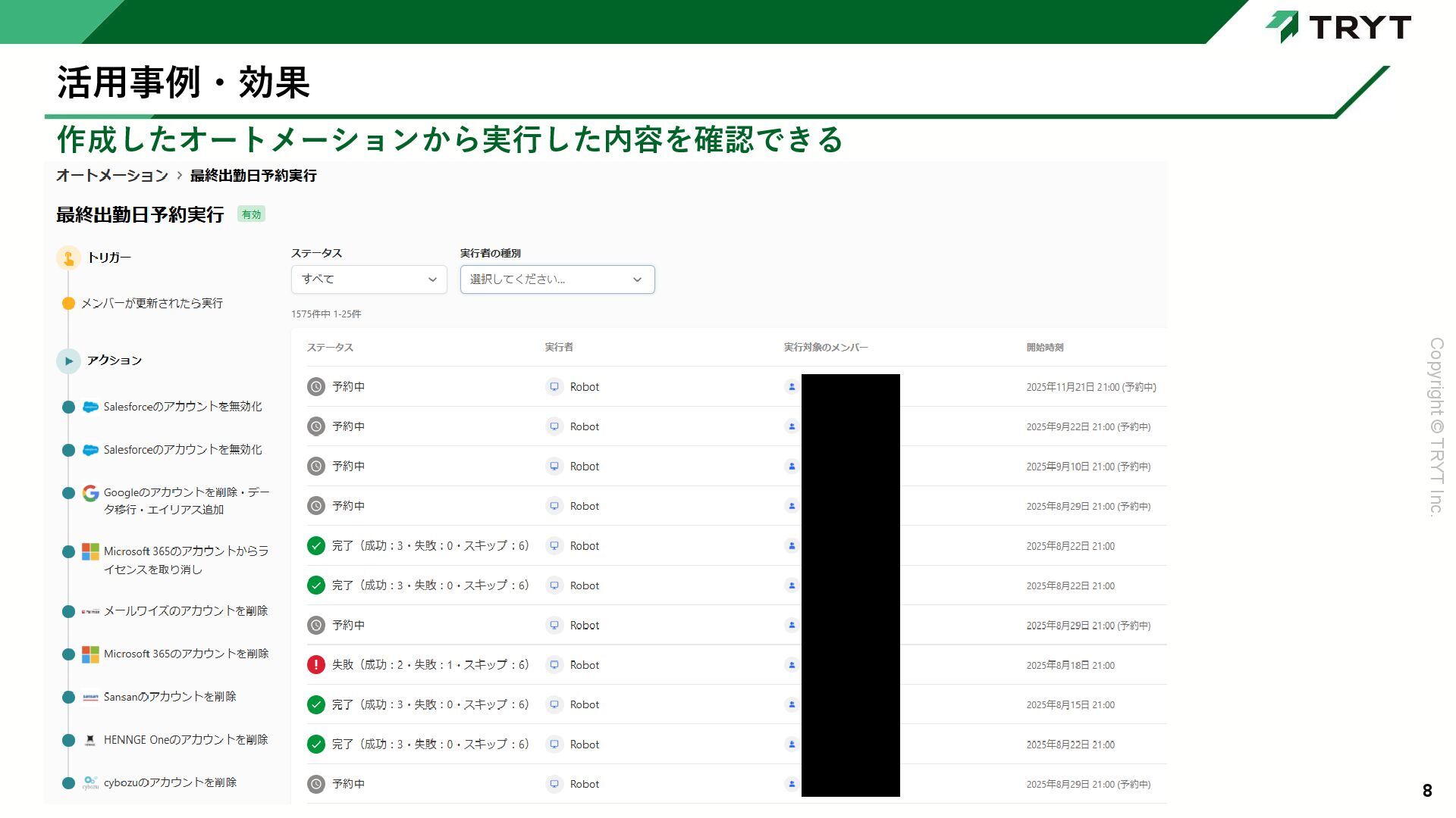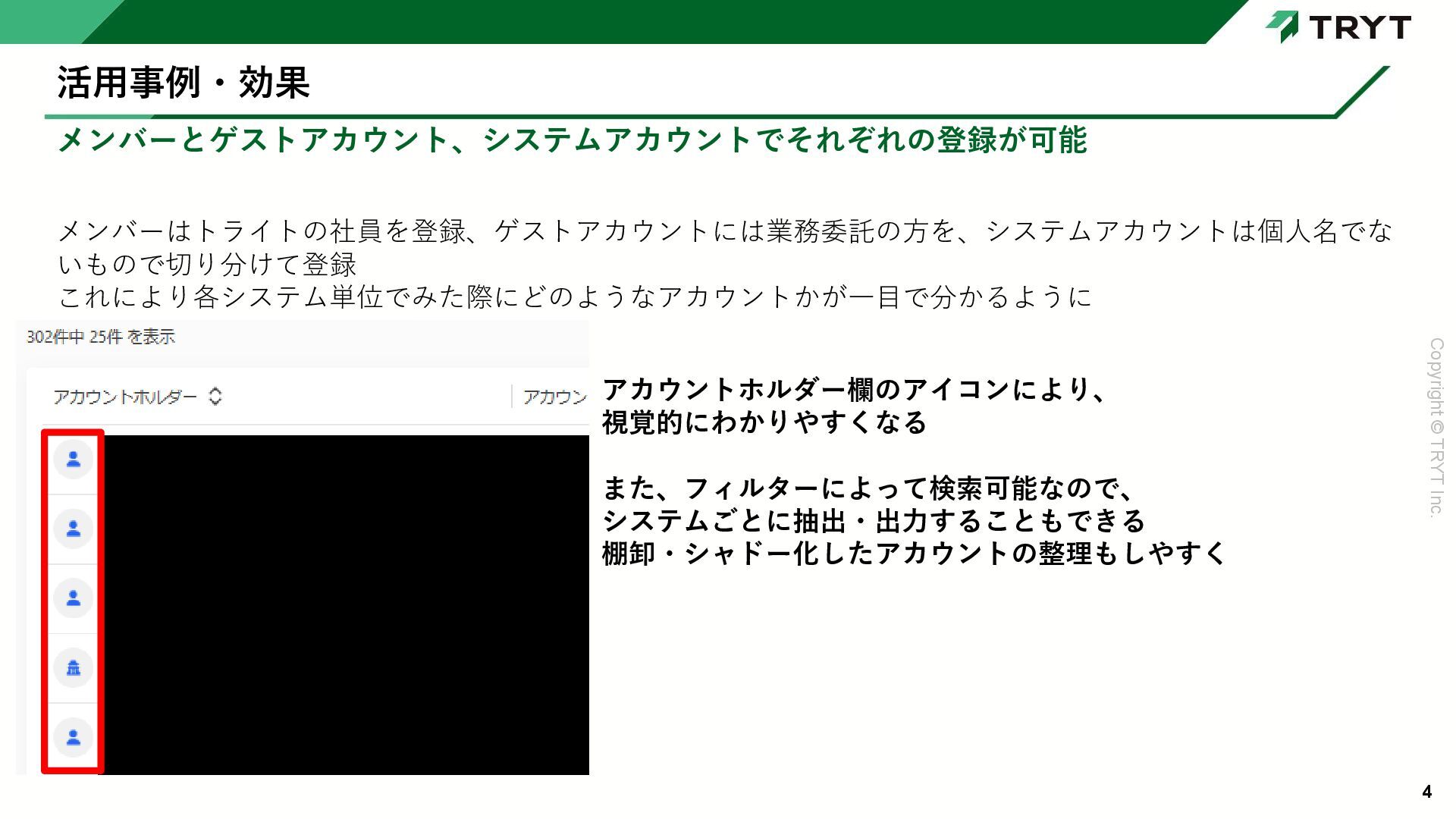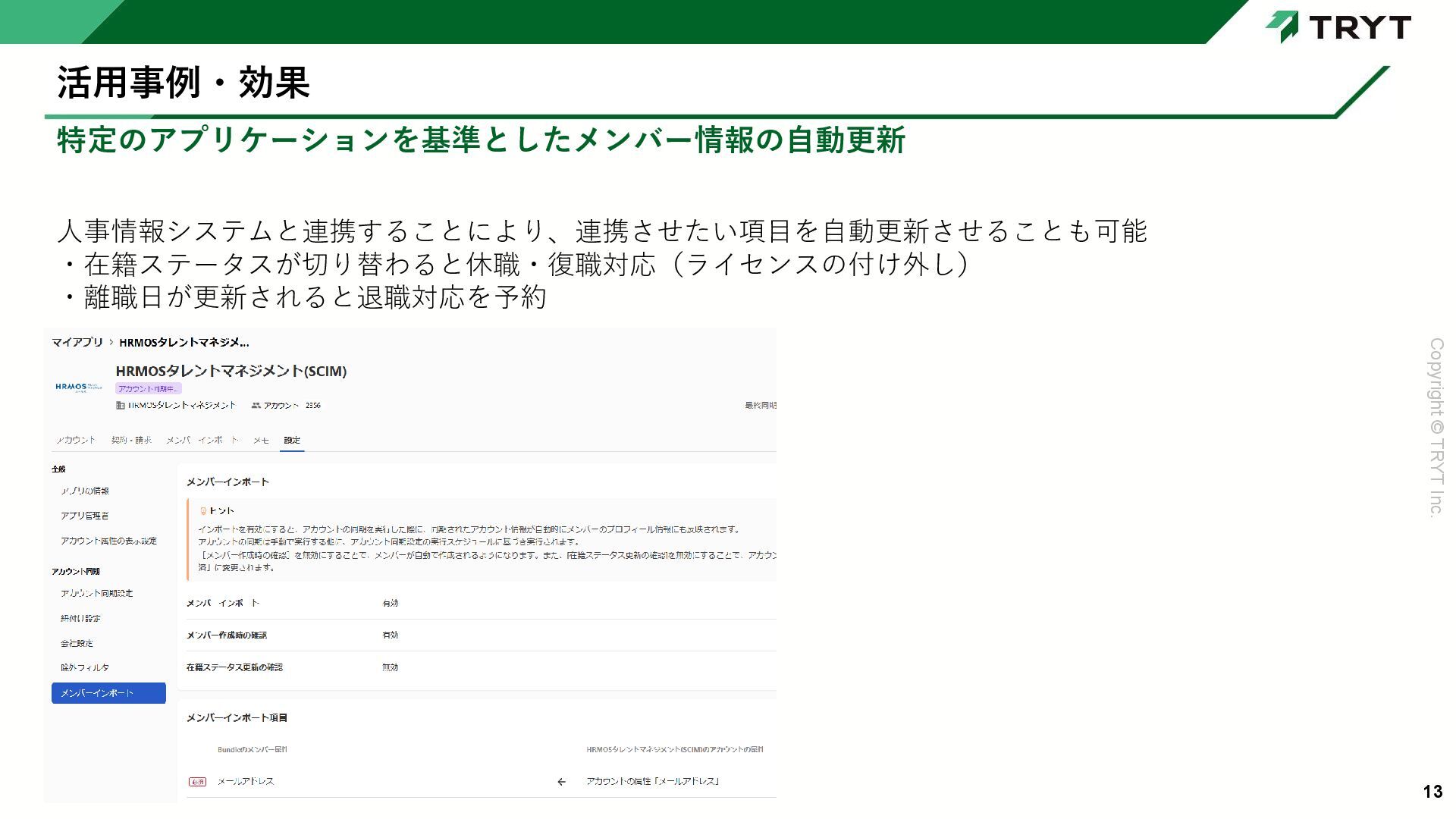 プロファイルは変更するだけで良いのだが、 権限セットと公開グループは追加と削除で分かれており、 削除が一括での対応が不可だったという背景があり、 このオートメーションにより作業効率が大幅にアップした。 Salesforceに留まらず、 各アプリの権限形態によってカスタム項目を作成し、 自動変更のロジックをより確実なものとしている。 また、カスタム項目に権限名を設定しておくとメンバー表から どのような設定がされているかも わかりやすくなる副次的効果もある。 自動化の恩恵として、 異動日に変更がされていない場合の責任の所在が明確になる。