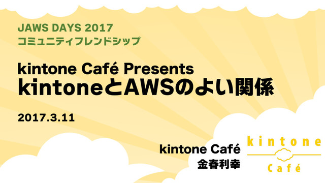 LJOUPOF$BGÉ1SFTFOUT kintoneとAWSのよい関係 JAWS DAYS 2017 コミュニティフレンドシップ LJOUPOF$BGÉ 金春利幸 2017.3.11