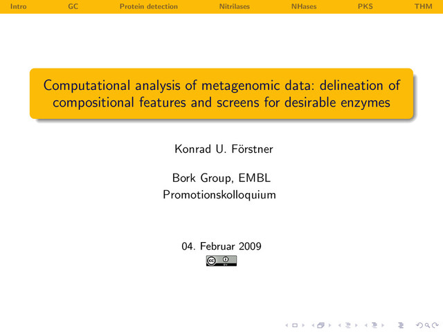 of metagenomic data: delineation of compositional features and screens for desirable enzymes Konrad U. F¨ orstner Bork Group, EMBL Promotionskolloquium 04. Februar 2009