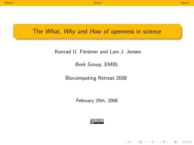 using the beamer class, TeX Live and Emacs. All these programs run on OpenBSD. http://www.latex-project.org http://latex-beamer.sourceforge.net http://www.tug.org/texlive/ http://www.gnu.org/software/emacs http://www.gimp.org/ http://www.openbsd.org Published under the Creative Commons Attribution 3.0 License http://creativecommons.org/licenses/by/3.0/ Document version 1.0 2008/02/25
