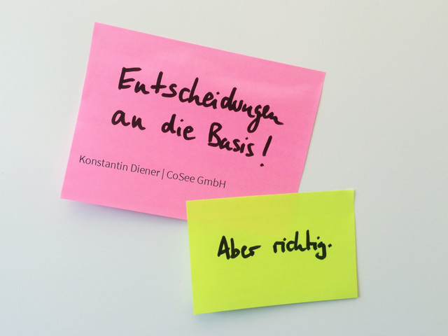 Die Märkte werden zunehmend komplexer und schnelllebiger. Sie erfordern Organisationen, die flexibel und mit hoher Geschwindigkeit reagieren und Entscheidungen treffen können. Diese tägliche Menge an Entscheidungen wird damit „zu groß für einen Kopf“. Um zu bestehen, müssen sie zunehmend an die Basis verlegt werden. Wie aber funktioniert das?