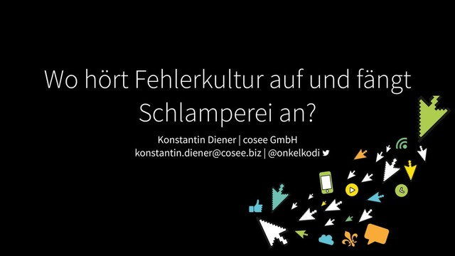 Die Firma cosee aus Darmstadt entwickelt Software. Dabei passieren immer wieder kleine und große Fehler. Und jedes Mal stellt sich die Frage: War das vermeidbar? Haben wir hier einfach nur geschlampt? Andererseits hilft es nicht, jede Entscheidung endlos zu planen und abzusichern. Denn Fehler helfen uns, wichtige Lektionen zu lernen. Wie aber stellen wir das Lernen sicher? Konstantin Diener gibt Beispiele, mit welchen Techniken er und das cosee-Team versuchen, aus Fehlern zu lernen.