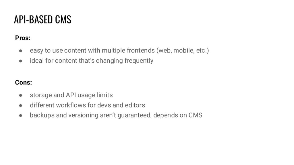 frontends (web, mobile, etc.) • ideal for content that’s changing frequently Cons: • storage and API usage limits • different workflows for devs and editors • backups and versioning aren’t guaranteed, depends on CMS