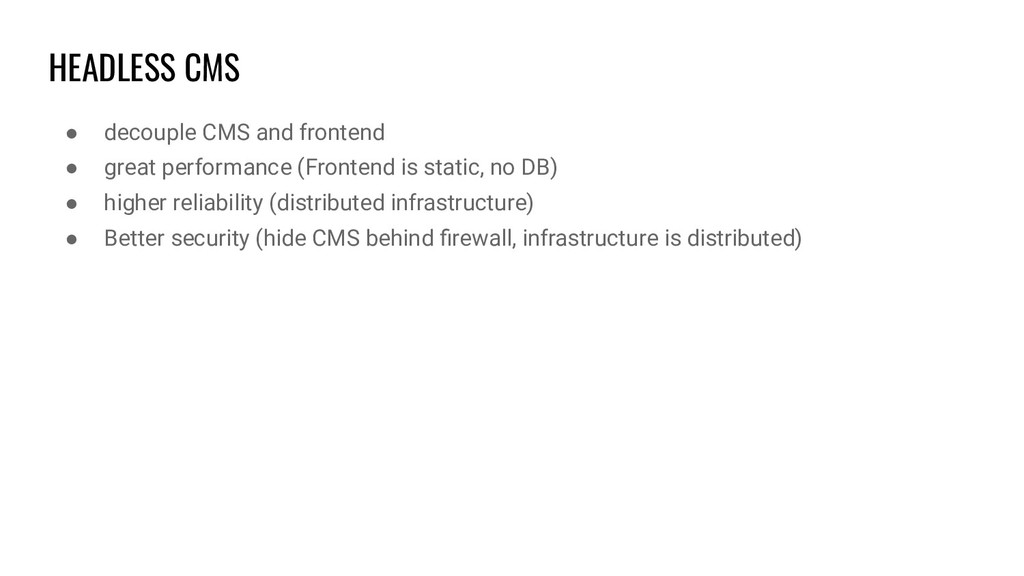 for devs and editors • automated backup and versioning • simple setup Cons: • difficult to use for multiple frontends • not great for content that changes frequently • content queries are limited by CMS