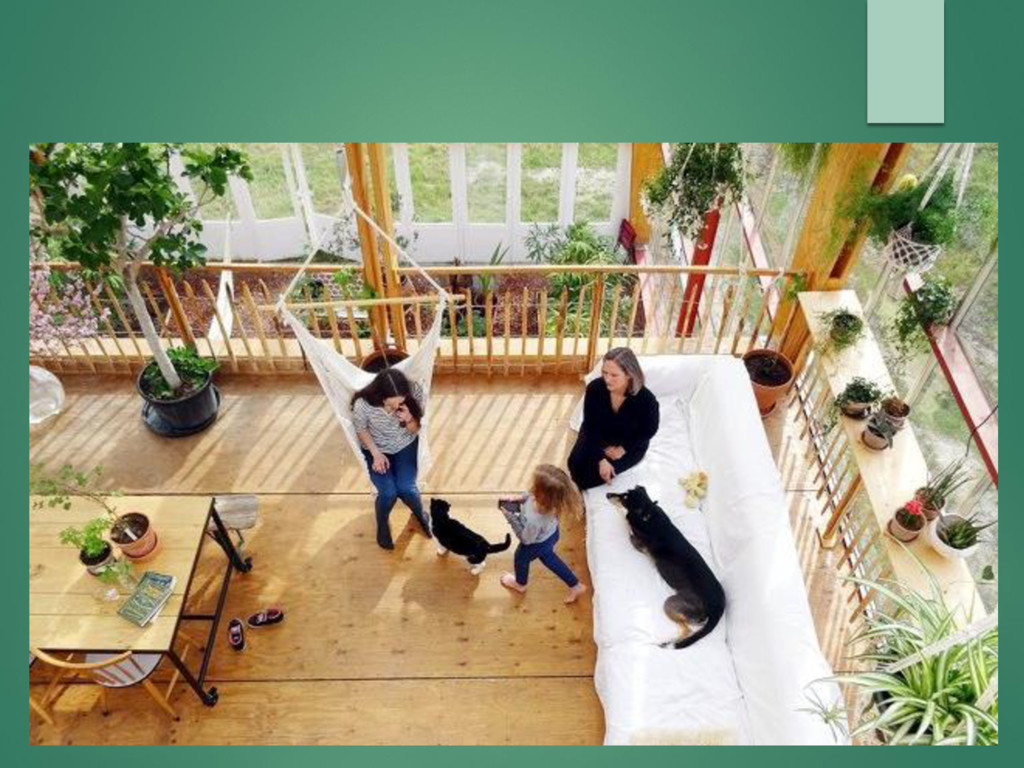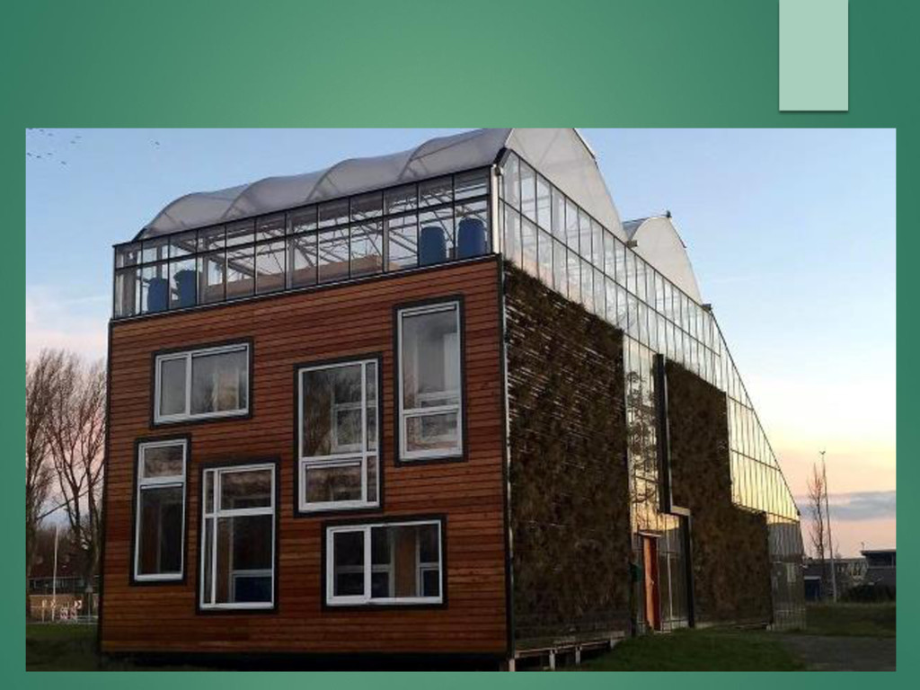 Роттердамского Место реализации – Голландия Озеленение фасада дома для тепло- и звукоизоляции, использование теплиц для создания комфортного микроклимата для людей и растений Решения энергогенерации в здании: - геотермальная установка - солнечные коллекторы - очистка сточных вод
