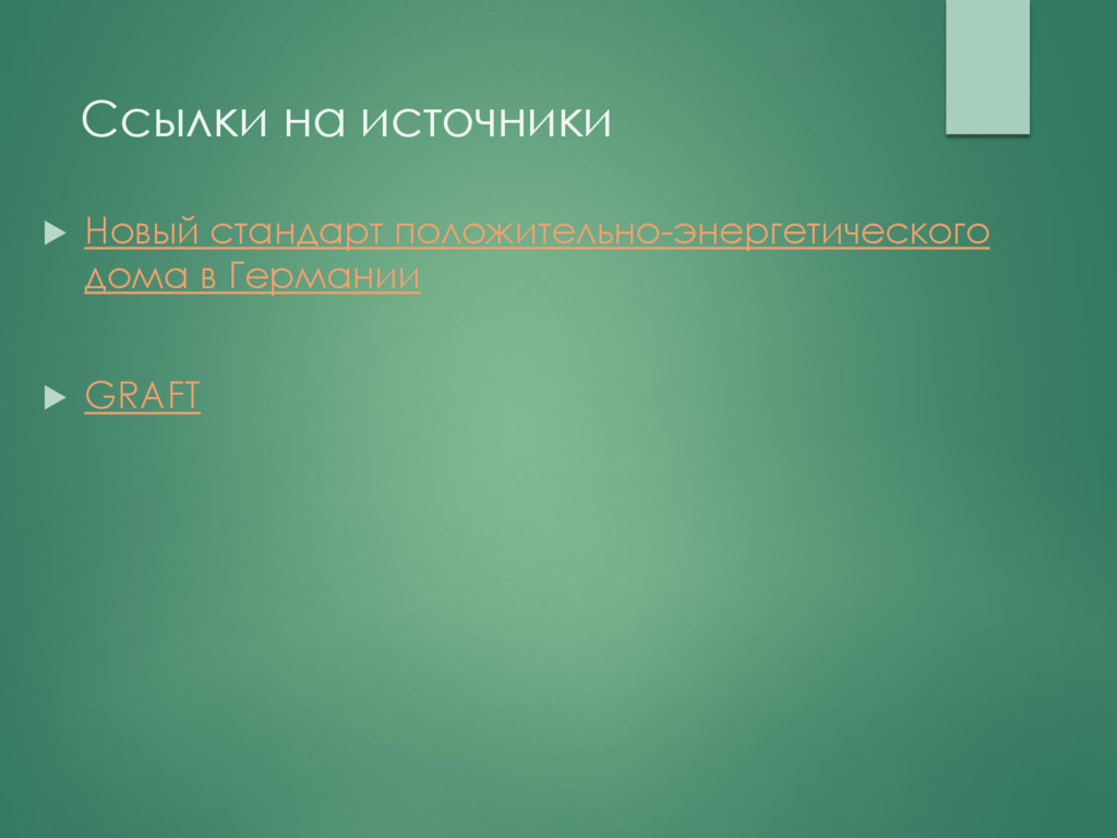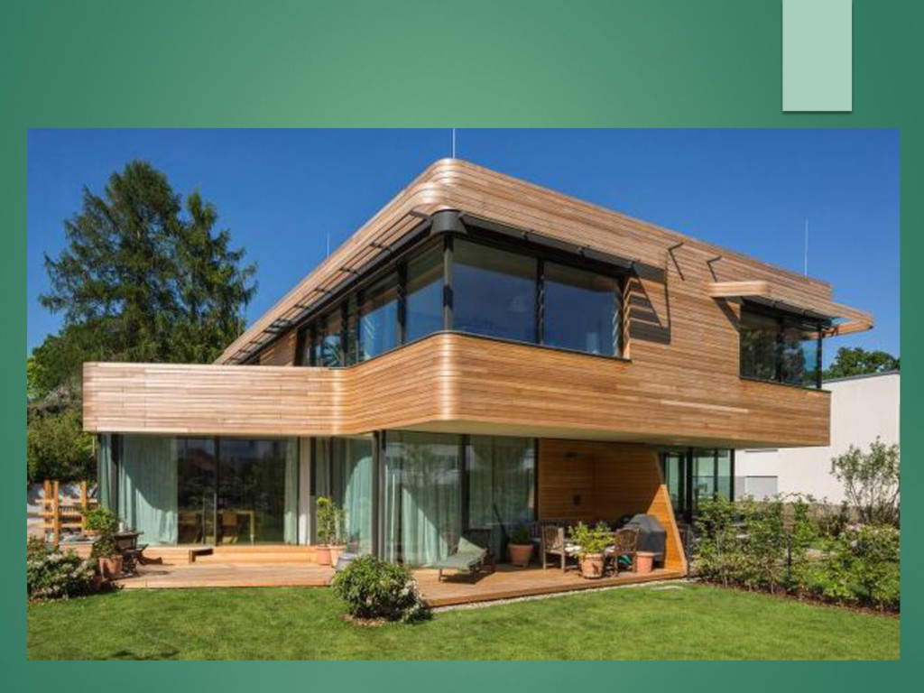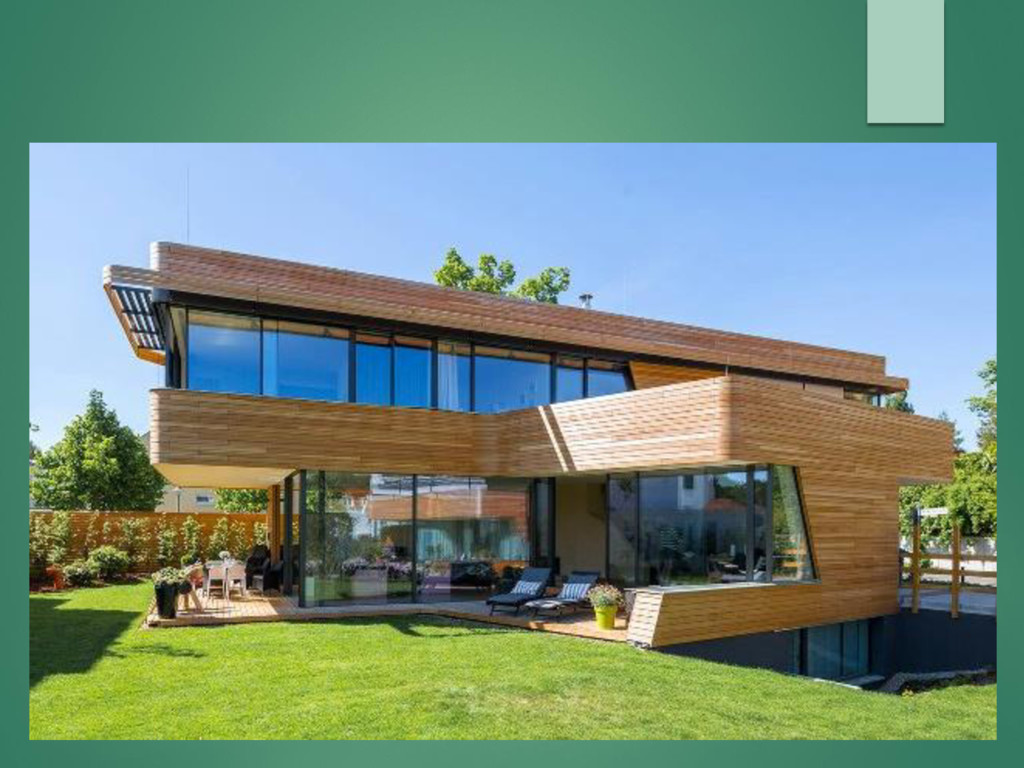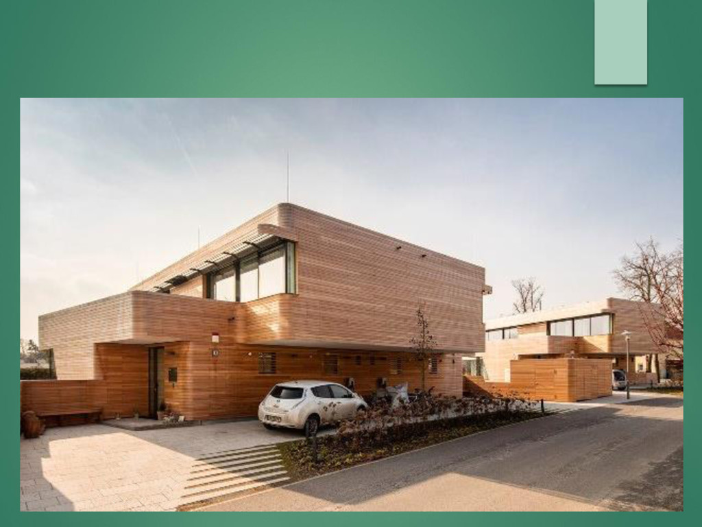 Graft Место реализации – Германия, между Берлином и Потсдамом Выполнен из древесины, утеплен теплоизоляцией из древесного волокна и обработаны внутри глиняной штукатуркой. Соответствуют стандарту положительно-энергетического дома, разработанного Министерством Транспорта, Строительства и Градостроительства ФРГ Решения энергогенерации в здании: - геотермальная установка - солнечные батареи - тепловой насос - вентиляционная установка с рекуперацией тепла