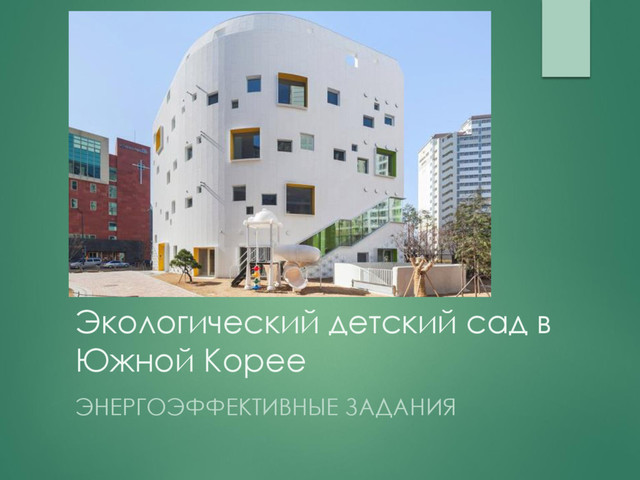 Место реализации – Корея, Сеул Уникальное по своей архитектуре и решениям здание позволяет быть ему не только энергоэффективным, но и дружественным по отношению к детям. Решения энергогенерации в здании: - солнечные батареи - использование сточных, дождевых вод