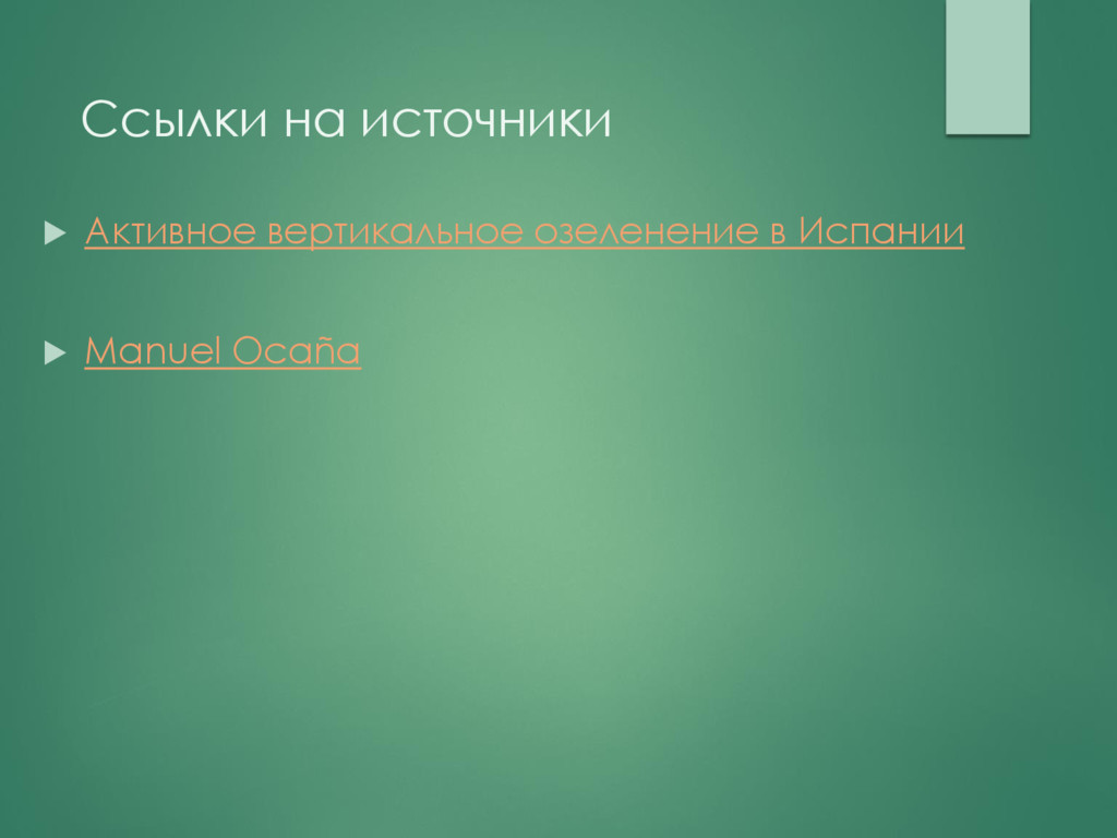 Manuel Ocana Место реализации – Испания, регион Мадрида Оригинальное вертикальное озеленение улучшает микроклимат вокруг дома, делает его благоприятным для нахождения людей, обитания птиц. Решения энергогенерации в здании: - использование живых растений ля создания микроклимата