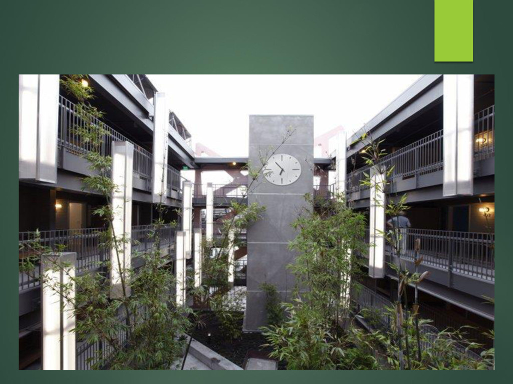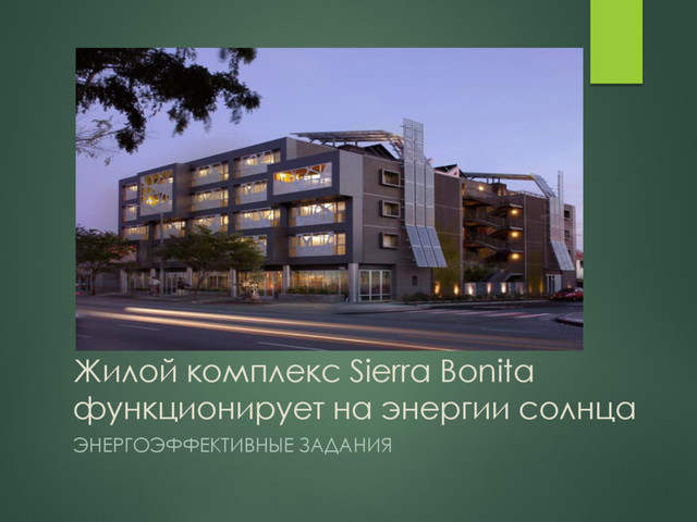 Tighe Место реализации – Западный Голливуд, Калифорния, США Проект получил исполнен с учетом всех тенденций строительства эко-домов: - Естественное освещение здания с ориентацией на юг - Экологичные материалы конструкций - Для организации микроклимата в комплексе используются растения Решения энергогенерации в здании: - Солнечные батареи - Солнечные коллекторы