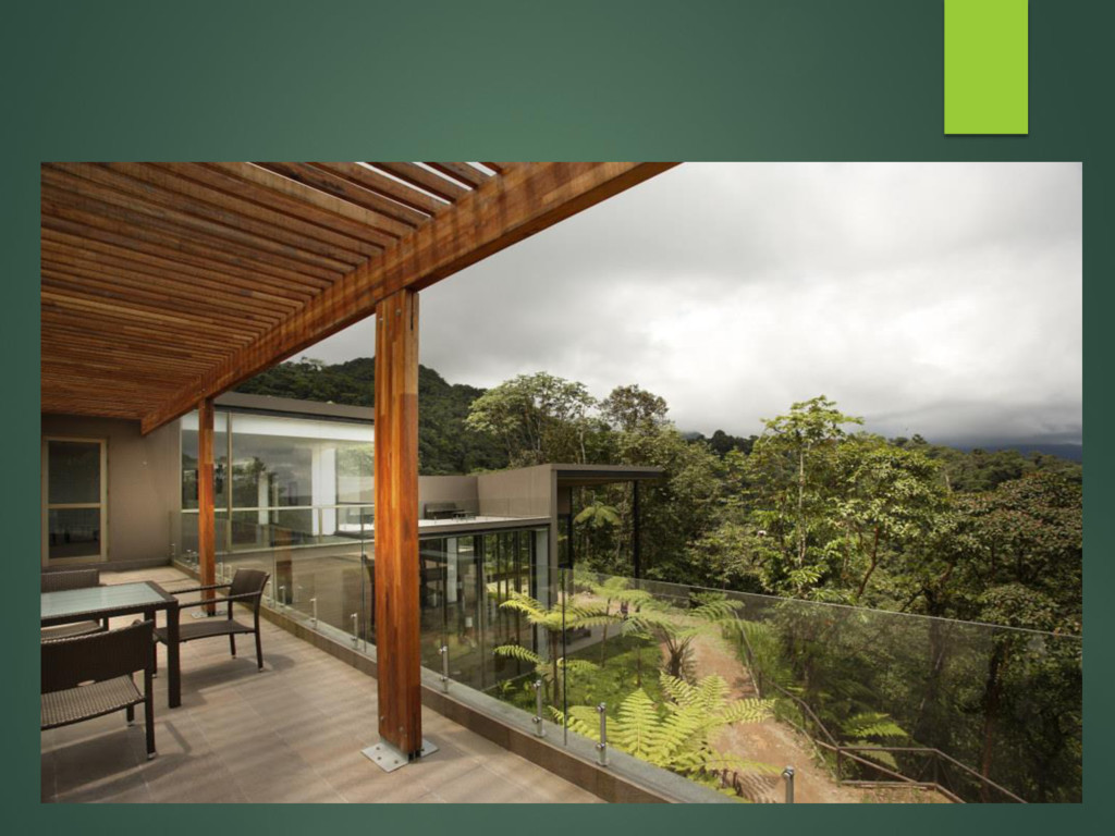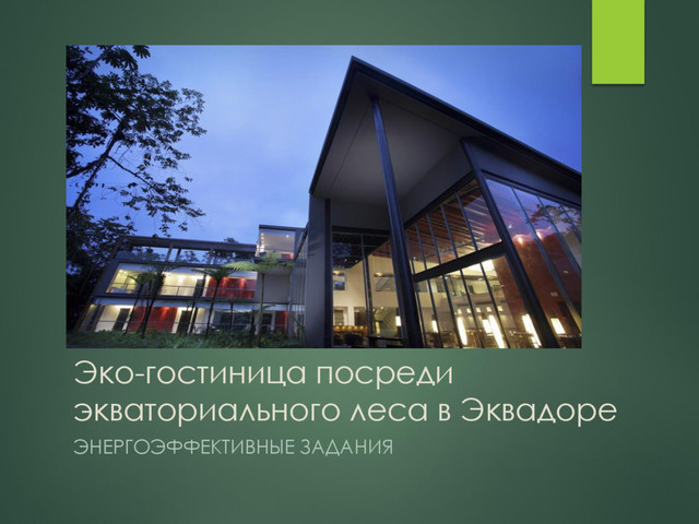 Место реализации – Регион Чоко, Эквадор Проект получил статус эко-курорта который призван сохранить флору и фауну леса площадью 1300 Га Экологические решения: - LED освещение - Полная переработка и утилизация отходов на территории комплекса - Очистка используемой воды