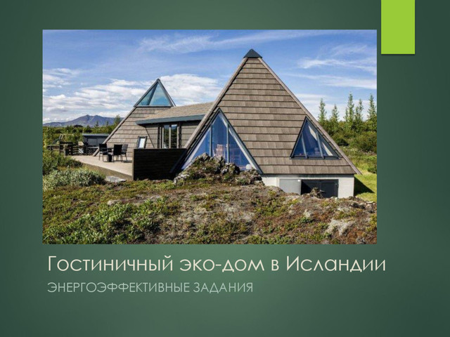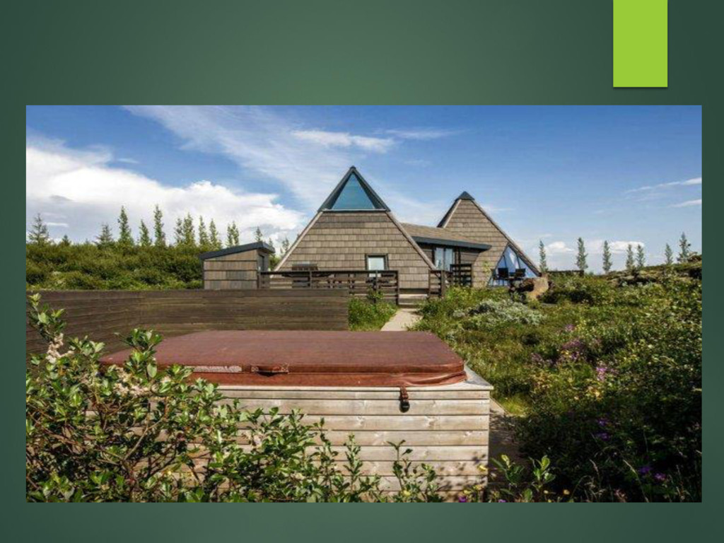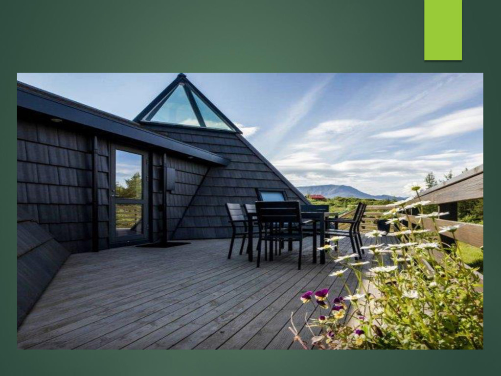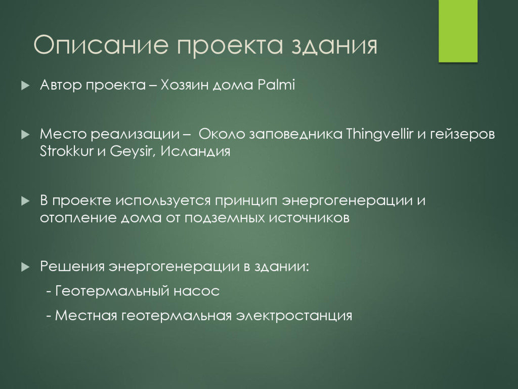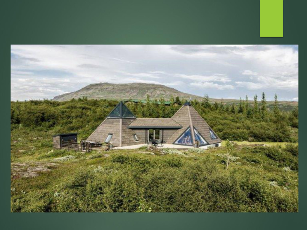 Место реализации – Около заповедника Thingvellir и гейзеров Strokkur и Geysir, Исландия В проекте используется принцип энергогенерации и отопление дома от подземных источников Решения энергогенерации в здании: - Геотермальный насос - Местная геотермальная электростанция