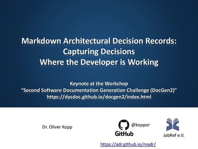An Architectural Decision (AD) is a software design choice that addresses a functional or non-functional requirement that is architecturally significant. This might, for instance, be a technology choice (e.g., Java vs. JavaScript), a choice of the IDE (e.g., IntelliJ vs. Eclipse IDE), a choice between a library (e.g., SLF4J vs java.util.logging), or a decision on features (e.g., infinite undo vs. limited undo). It should be as easy as possible to a) write down the decisions and b) to version the decisions. “Markdown and Architectural Decision Records” are one way to fulfill these requirements. This talk outlines MADR, presents its current use and outlines next research and development steps.