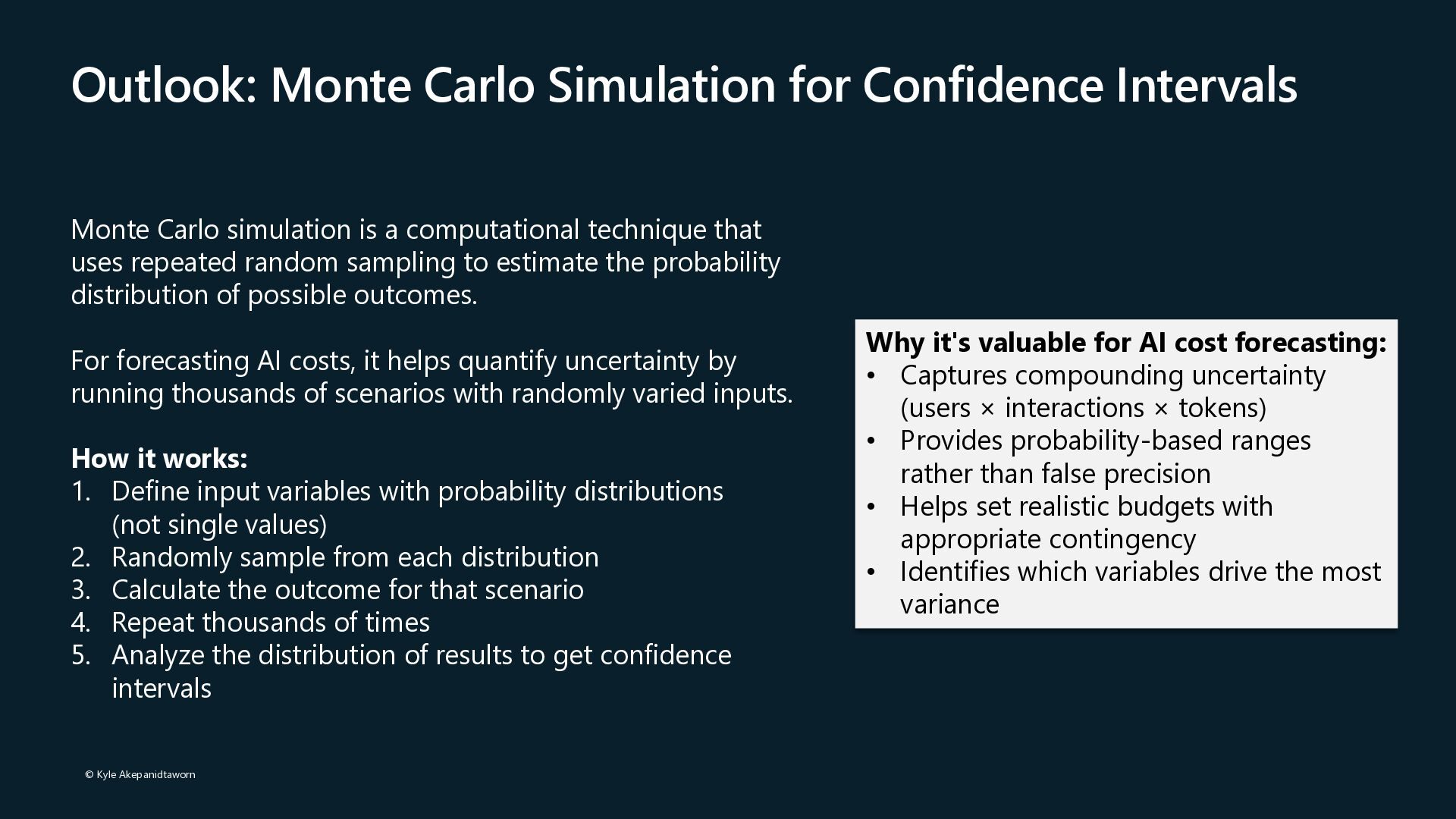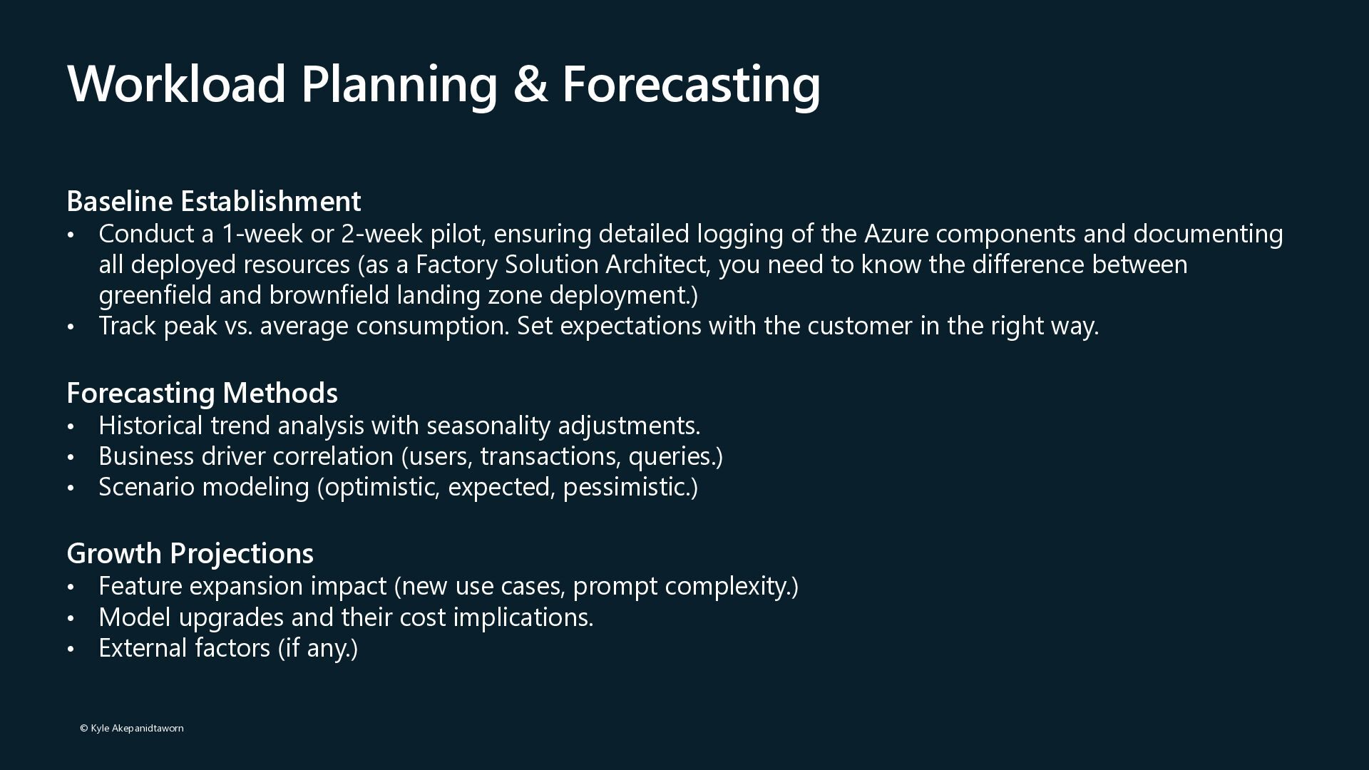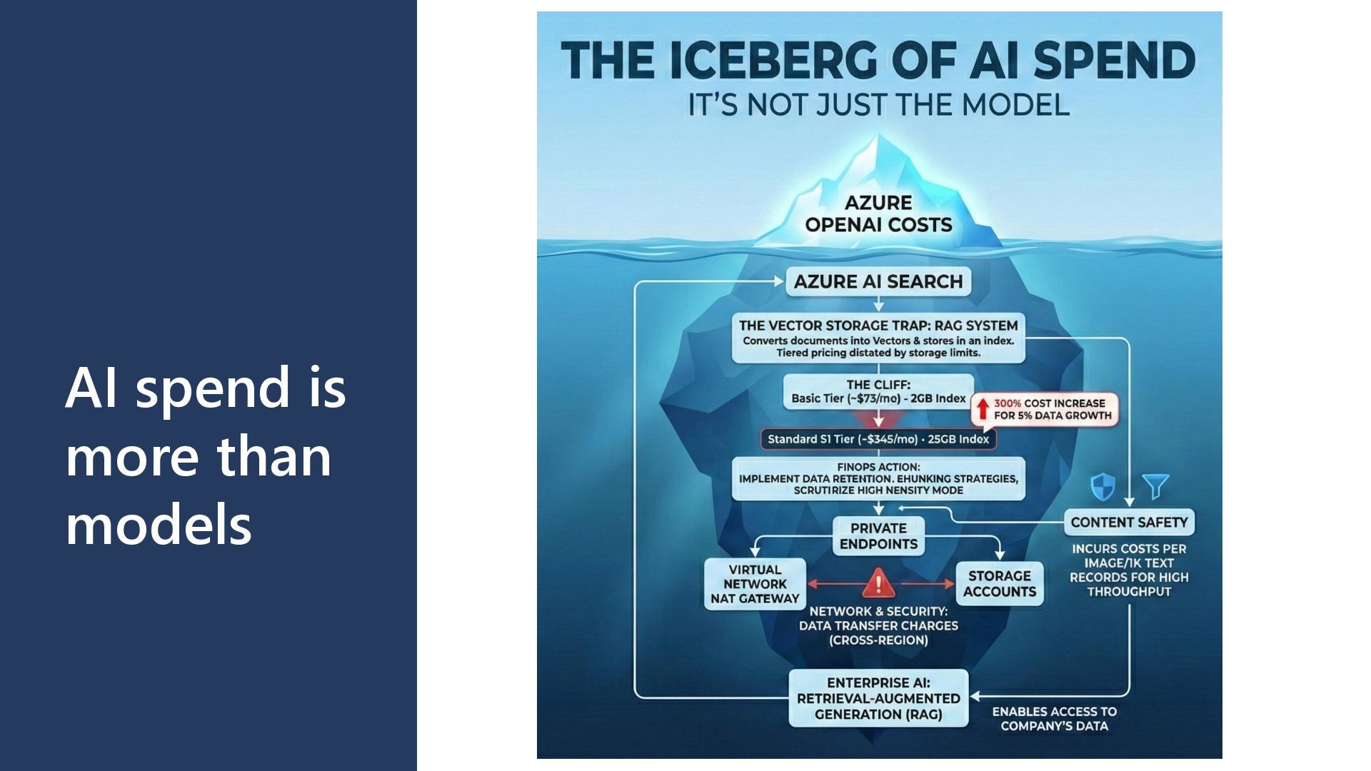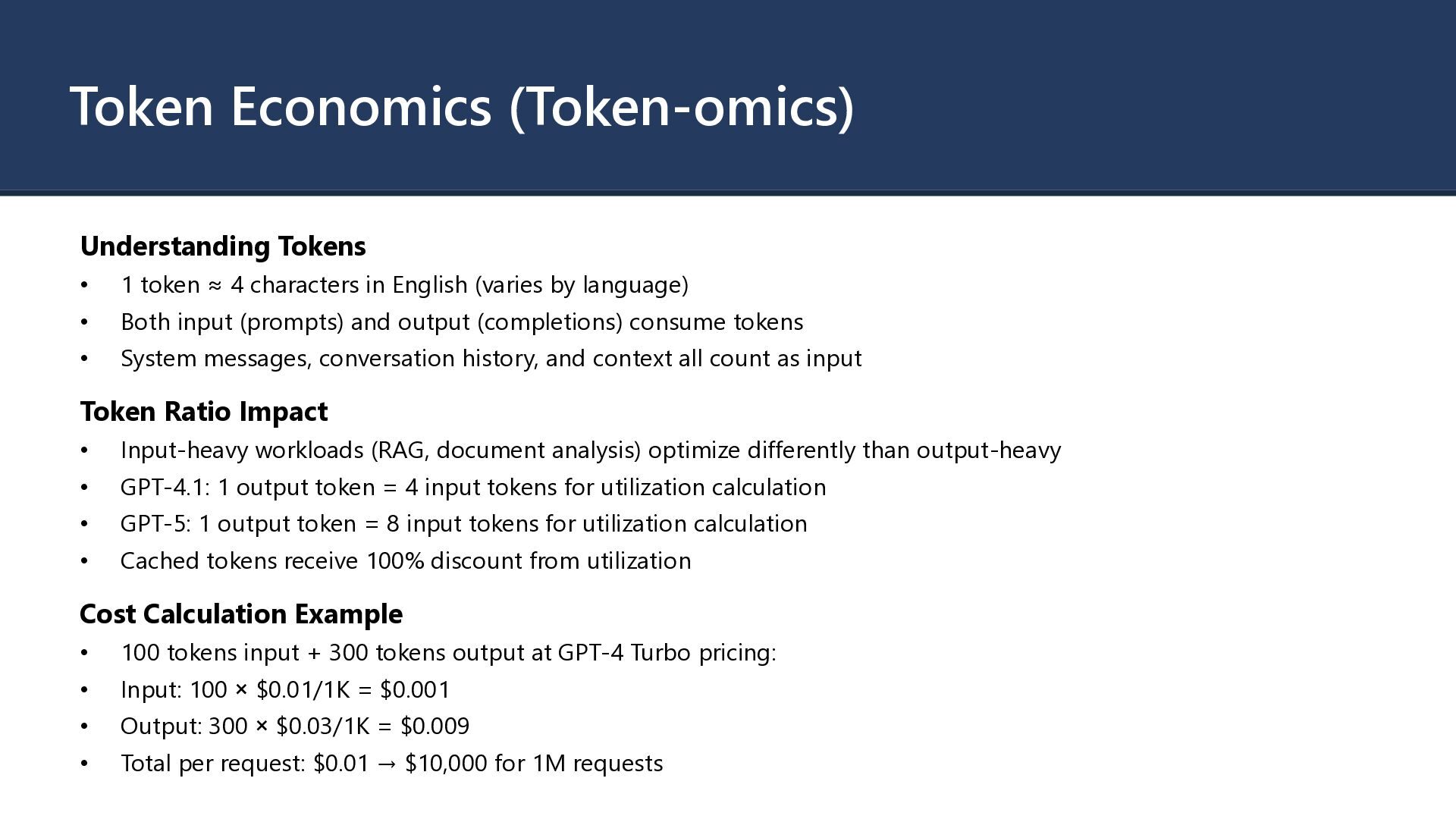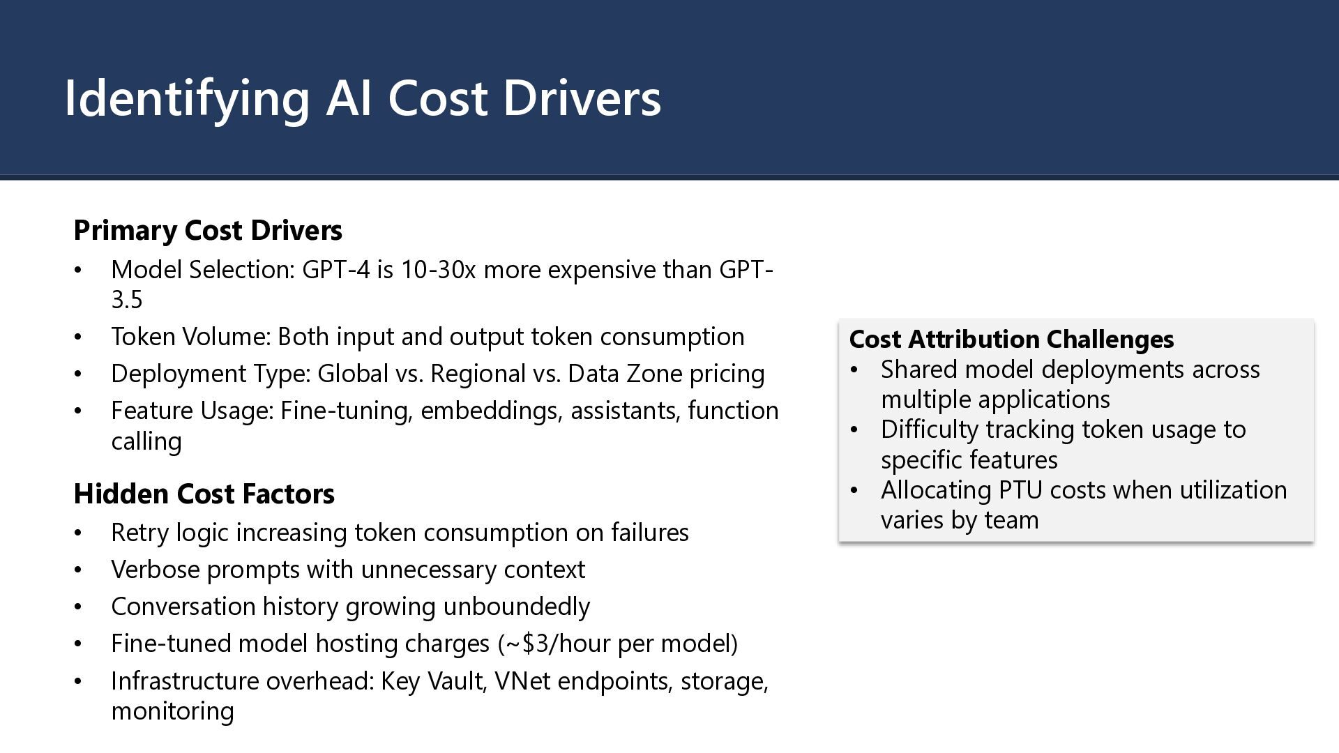 GPT-4 is 10-30x more expensive than GPT- 3.5 • Token Volume: Both input and output token consumption • Deployment Type: Global vs. Regional vs. Data Zone pricing • Feature Usage: Fine-tuning, embeddings, assistants, function calling Hidden Cost Factors • Retry logic increasing token consumption on failures • Verbose prompts with unnecessary context • Conversation history growing unboundedly • Fine-tuned model hosting charges (~$3/hour per model) • Infrastructure overhead: Key Vault, VNet endpoints, storage, monitoring Cost Attribution Challenges • Shared model deployments across multiple applications • Difficulty tracking token usage to specific features • Allocating PTU costs when utilization varies by team