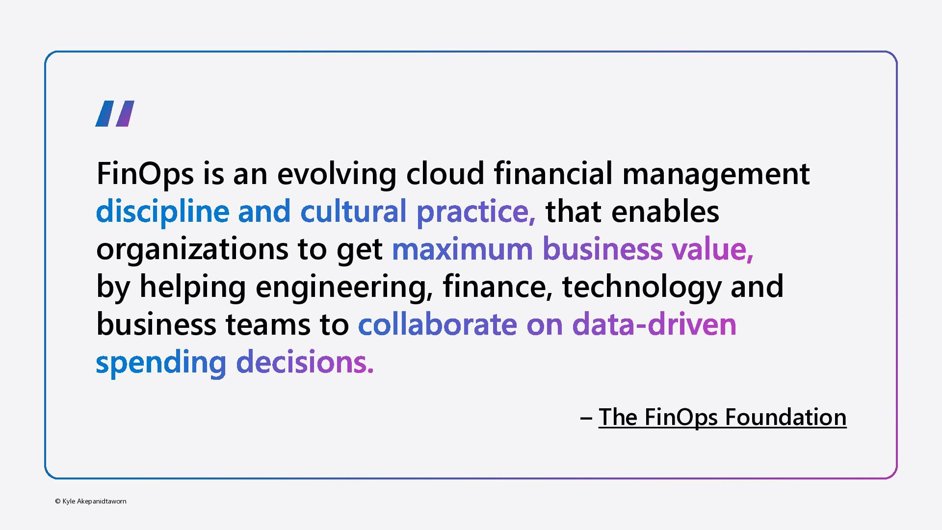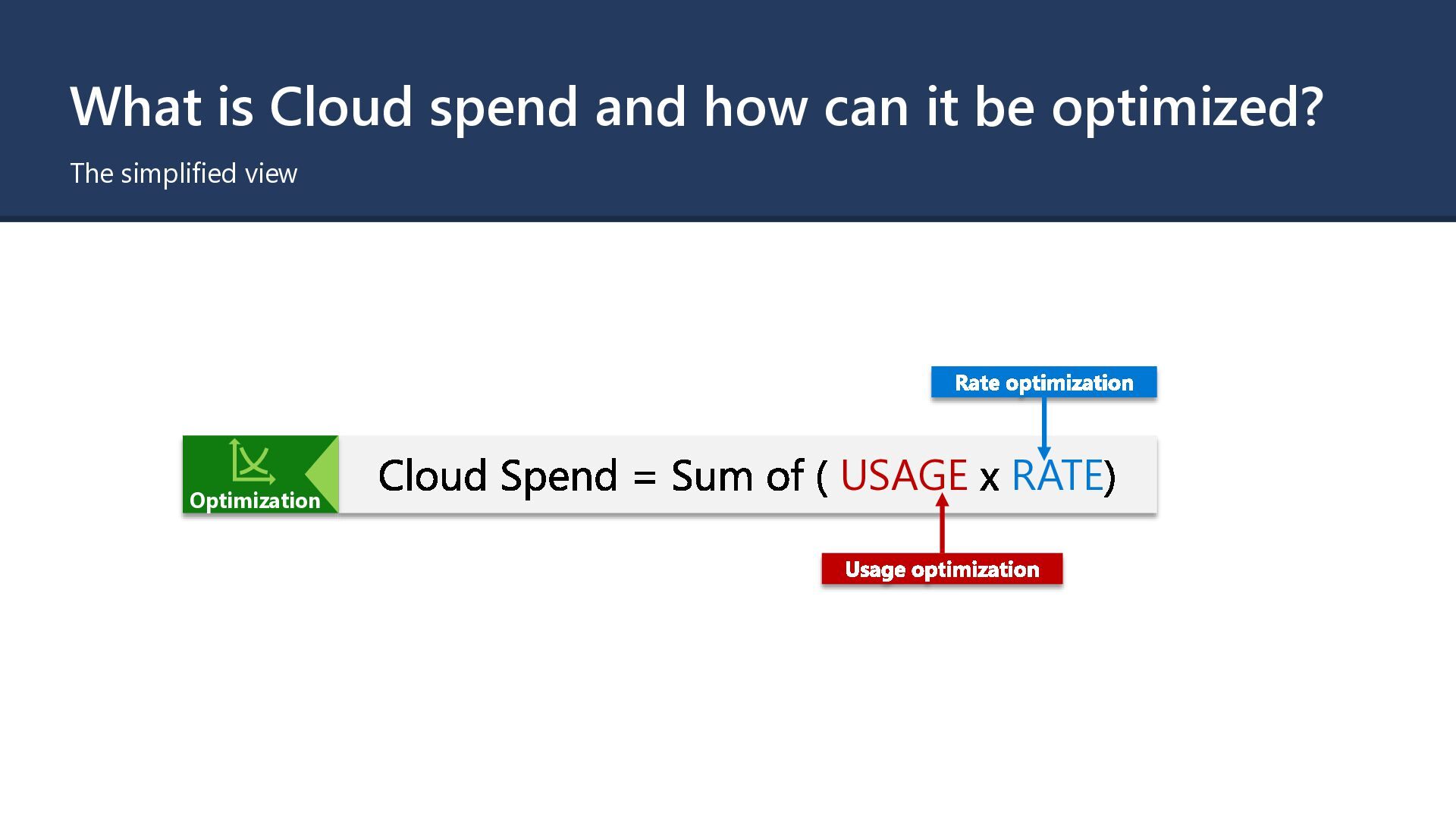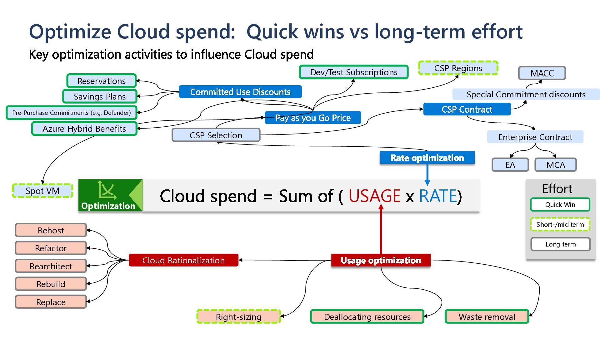 = Sum of ( USAGE x RATE) Rate optimization CSP Contract Pay as you Go Price Committed Use Discounts Reservations Savings Plans CSP Selection CSP Regions Enterprise Contract Special Commitment discounts Usage optimization Waste removal Deallocating resources Right-sizing Cloud Rationalization Rehost Refactor Rearchitect Rebuild Replace Key optimization activities to influence Cloud spend EA MCA MACC Optimization Dev/Test Subscriptions Spot VM Quick Win Short-/mid term Long term Effort Pre-Purchase Commitments (e.g. Defender) Azure Hybrid Benefits