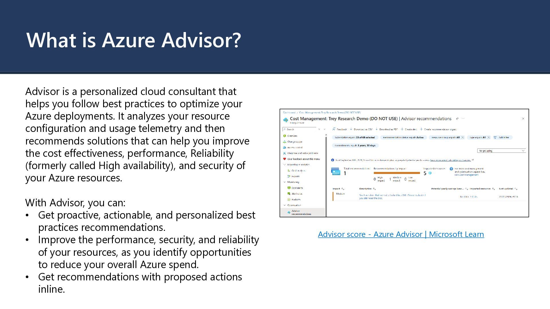 that helps you follow best practices to optimize your Azure deployments. It analyzes your resource configuration and usage telemetry and then recommends solutions that can help you improve the cost effectiveness, performance, Reliability (formerly called High availability), and security of your Azure resources. With Advisor, you can: • Get proactive, actionable, and personalized best practices recommendations. • Improve the performance, security, and reliability of your resources, as you identify opportunities to reduce your overall Azure spend. • Get recommendations with proposed actions inline. Advisor score - Azure Advisor | Microsoft Learn