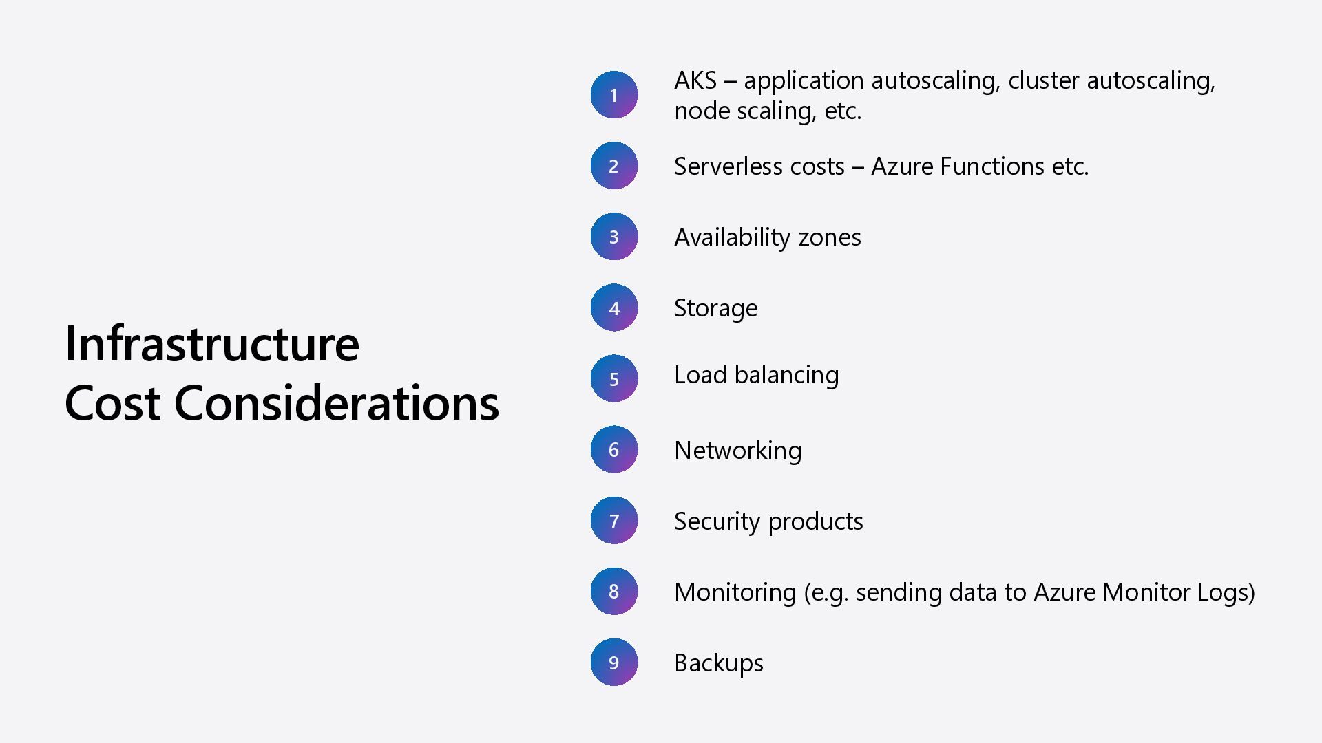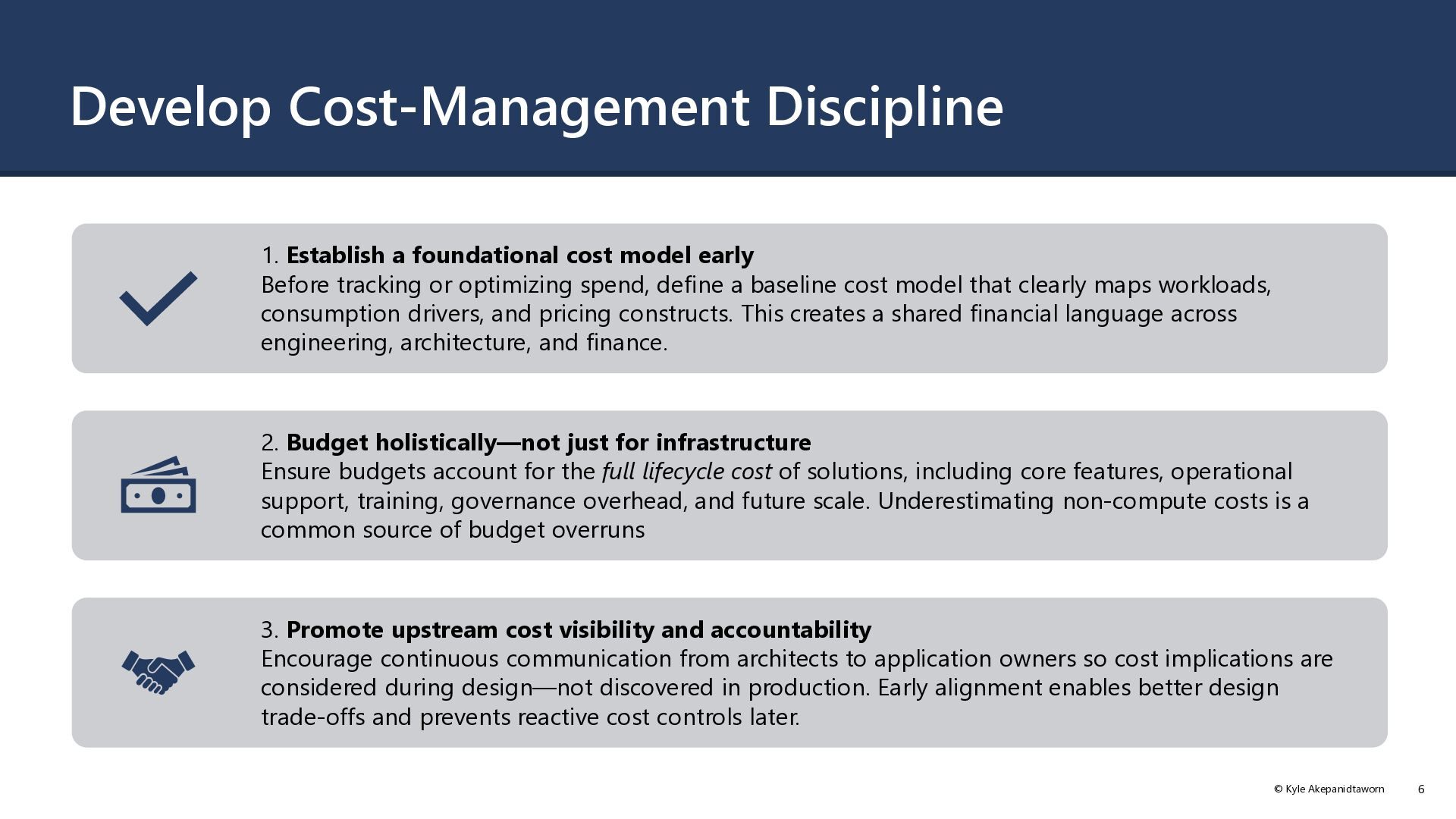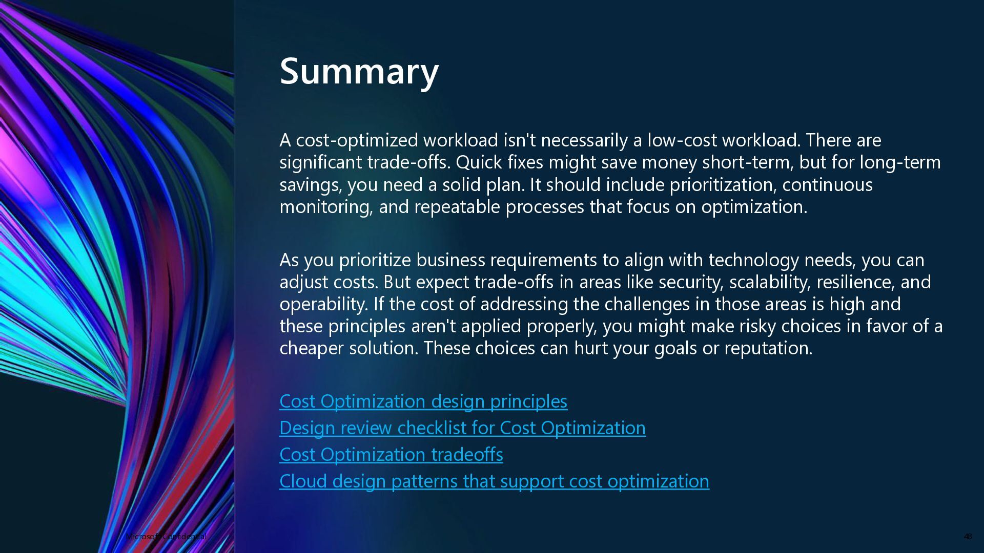 are significant trade-offs. Quick fixes might save money short-term, but for long-term savings, you need a solid plan. It should include prioritization, continuous monitoring, and repeatable processes that focus on optimization. As you prioritize business requirements to align with technology needs, you can adjust costs. But expect trade-offs in areas like security, scalability, resilience, and operability. If the cost of addressing the challenges in those areas is high and these principles aren't applied properly, you might make risky choices in favor of a cheaper solution. These choices can hurt your goals or reputation. Cost Optimization design principles Design review checklist for Cost Optimization Cost Optimization tradeoffs Cloud design patterns that support cost optimization Microsoft Confidential 48