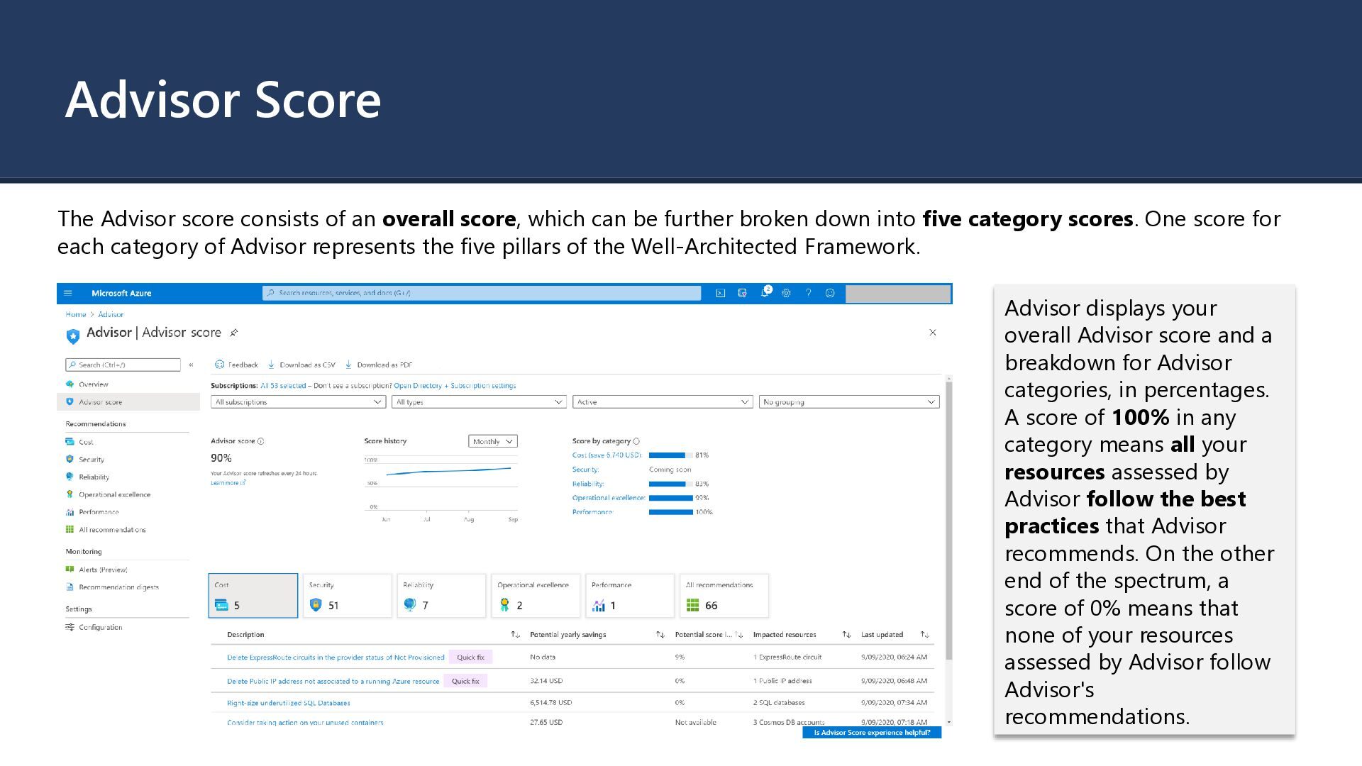 which can be further broken down into five category scores. One score for each category of Advisor represents the five pillars of the Well-Architected Framework. Advisor displays your overall Advisor score and a breakdown for Advisor categories, in percentages. A score of 100% in any category means all your resources assessed by Advisor follow the best practices that Advisor recommends. On the other end of the spectrum, a score of 0% means that none of your resources assessed by Advisor follow Advisor's recommendations.