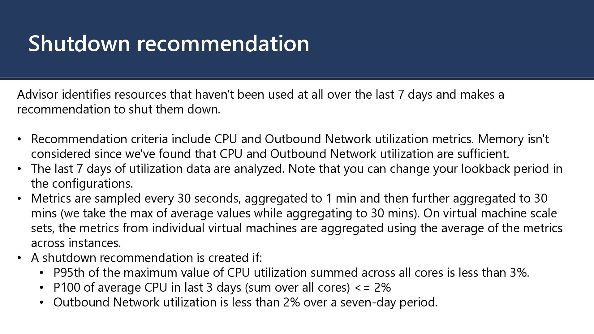 all over the last 7 days and makes a recommendation to shut them down. • Recommendation criteria include CPU and Outbound Network utilization metrics. Memory isn't considered since we've found that CPU and Outbound Network utilization are sufficient. • The last 7 days of utilization data are analyzed. Note that you can change your lookback period in the configurations. • Metrics are sampled every 30 seconds, aggregated to 1 min and then further aggregated to 30 mins (we take the max of average values while aggregating to 30 mins). On virtual machine scale sets, the metrics from individual virtual machines are aggregated using the average of the metrics across instances. • A shutdown recommendation is created if: • P95th of the maximum value of CPU utilization summed across all cores is less than 3%. • P100 of average CPU in last 3 days (sum over all cores) <= 2% • Outbound Network utilization is less than 2% over a seven-day period.