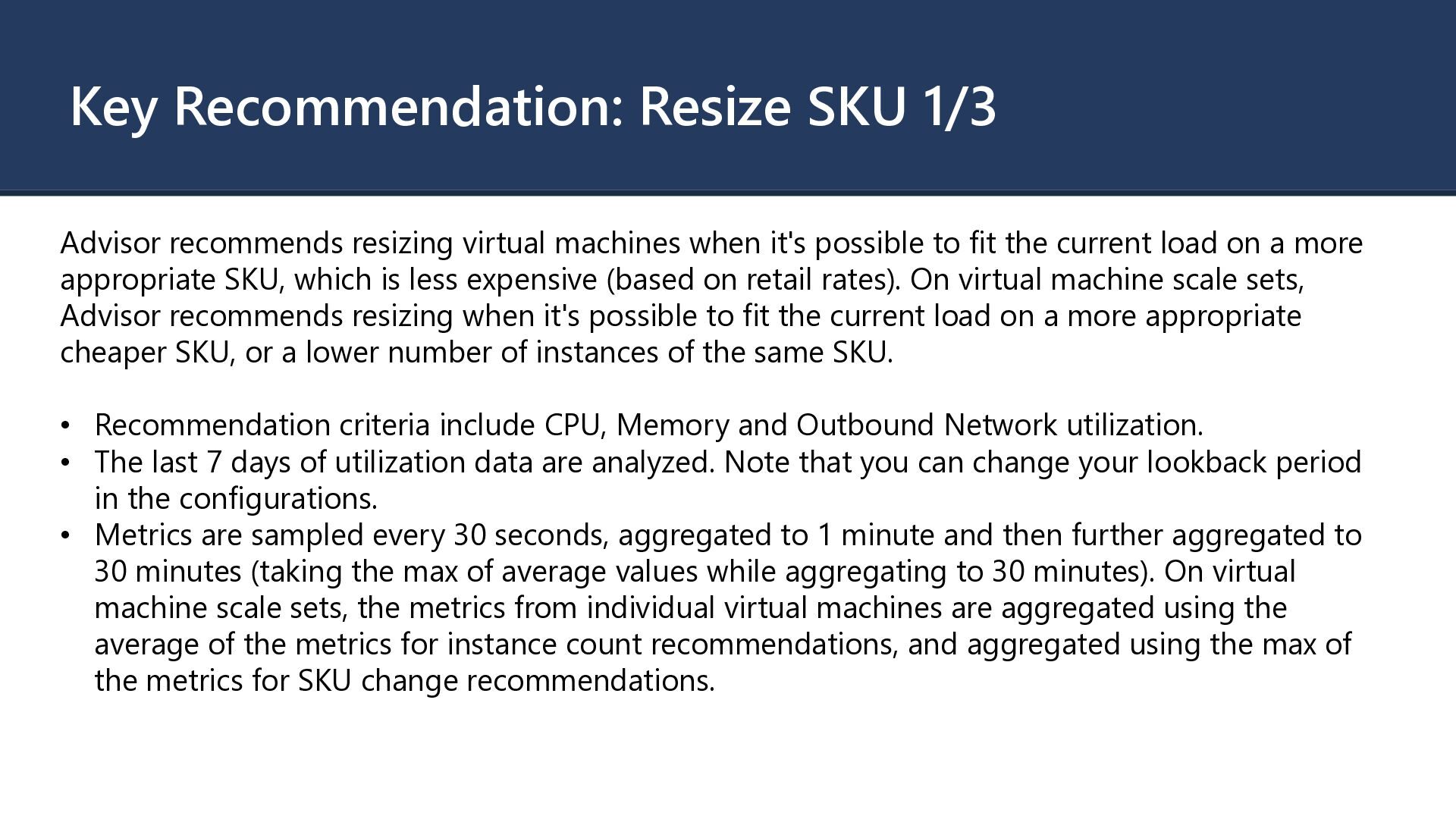 when it's possible to fit the current load on a more appropriate SKU, which is less expensive (based on retail rates). On virtual machine scale sets, Advisor recommends resizing when it's possible to fit the current load on a more appropriate cheaper SKU, or a lower number of instances of the same SKU. • Recommendation criteria include CPU, Memory and Outbound Network utilization. • The last 7 days of utilization data are analyzed. Note that you can change your lookback period in the configurations. • Metrics are sampled every 30 seconds, aggregated to 1 minute and then further aggregated to 30 minutes (taking the max of average values while aggregating to 30 minutes). On virtual machine scale sets, the metrics from individual virtual machines are aggregated using the average of the metrics for instance count recommendations, and aggregated using the max of the metrics for SKU change recommendations.