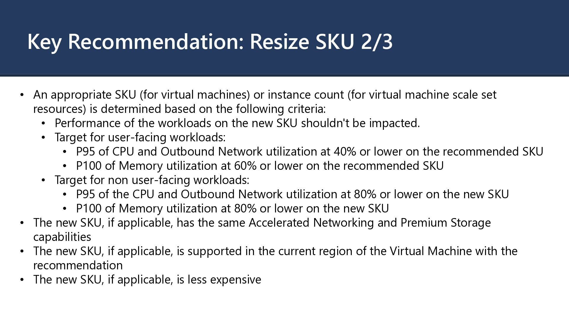 virtual machines) or instance count (for virtual machine scale set resources) is determined based on the following criteria: • Performance of the workloads on the new SKU shouldn't be impacted. • Target for user-facing workloads: • P95 of CPU and Outbound Network utilization at 40% or lower on the recommended SKU • P100 of Memory utilization at 60% or lower on the recommended SKU • Target for non user-facing workloads: • P95 of the CPU and Outbound Network utilization at 80% or lower on the new SKU • P100 of Memory utilization at 80% or lower on the new SKU • The new SKU, if applicable, has the same Accelerated Networking and Premium Storage capabilities • The new SKU, if applicable, is supported in the current region of the Virtual Machine with the recommendation • The new SKU, if applicable, is less expensive