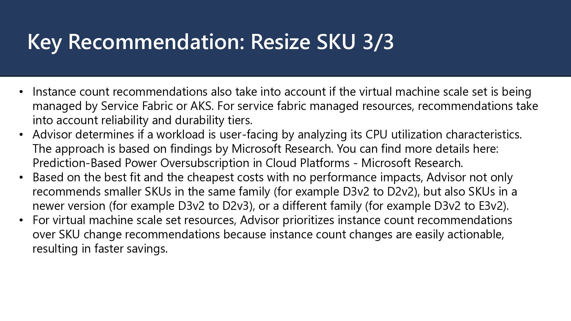 take into account if the virtual machine scale set is being managed by Service Fabric or AKS. For service fabric managed resources, recommendations take into account reliability and durability tiers. • Advisor determines if a workload is user-facing by analyzing its CPU utilization characteristics. The approach is based on findings by Microsoft Research. You can find more details here: Prediction-Based Power Oversubscription in Cloud Platforms - Microsoft Research. • Based on the best fit and the cheapest costs with no performance impacts, Advisor not only recommends smaller SKUs in the same family (for example D3v2 to D2v2), but also SKUs in a newer version (for example D3v2 to D2v3), or a different family (for example D3v2 to E3v2). • For virtual machine scale set resources, Advisor prioritizes instance count recommendations over SKU change recommendations because instance count changes are easily actionable, resulting in faster savings.