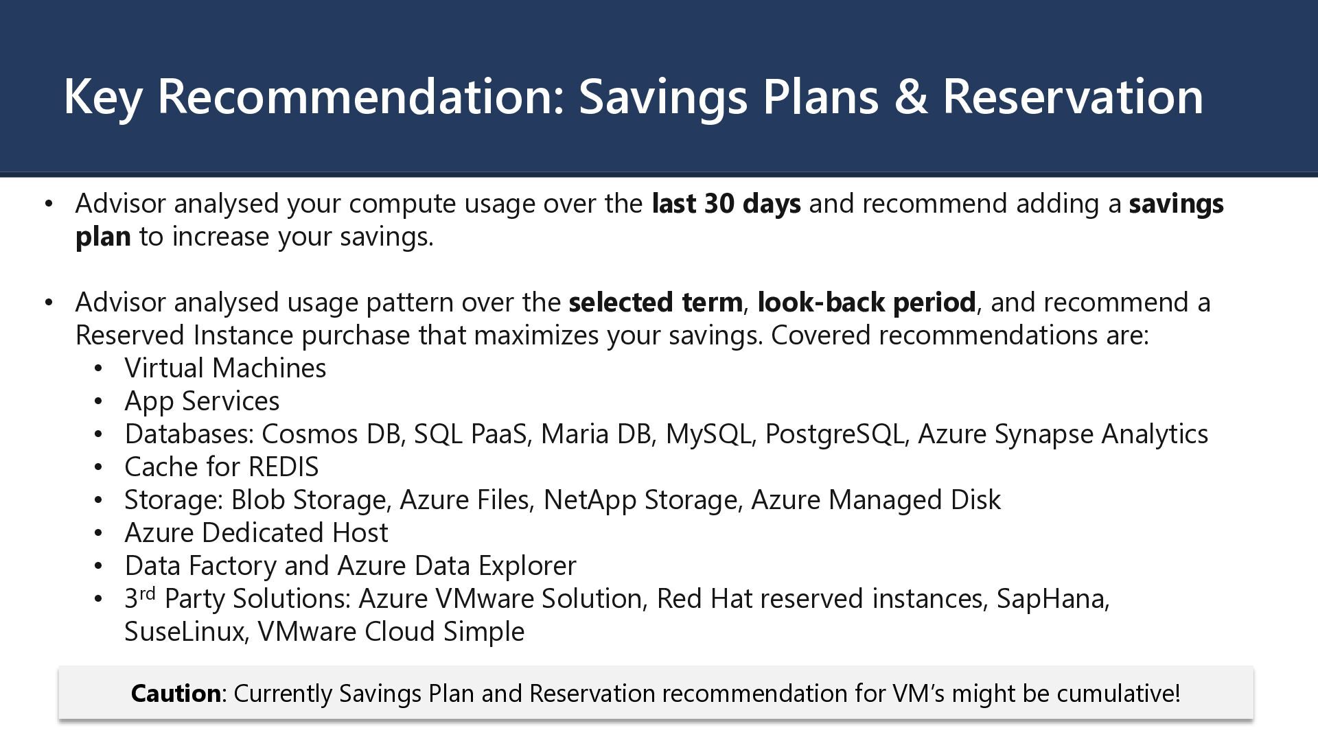 compute usage over the last 30 days and recommend adding a savings plan to increase your savings. • Advisor analysed usage pattern over the selected term, look-back period, and recommend a Reserved Instance purchase that maximizes your savings. Covered recommendations are: • Virtual Machines • App Services • Databases: Cosmos DB, SQL PaaS, Maria DB, MySQL, PostgreSQL, Azure Synapse Analytics • Cache for REDIS • Storage: Blob Storage, Azure Files, NetApp Storage, Azure Managed Disk • Azure Dedicated Host • Data Factory and Azure Data Explorer • 3rd Party Solutions: Azure VMware Solution, Red Hat reserved instances, SapHana, SuseLinux, VMware Cloud Simple Caution: Currently Savings Plan and Reservation recommendation for VM’s might be cumulative!