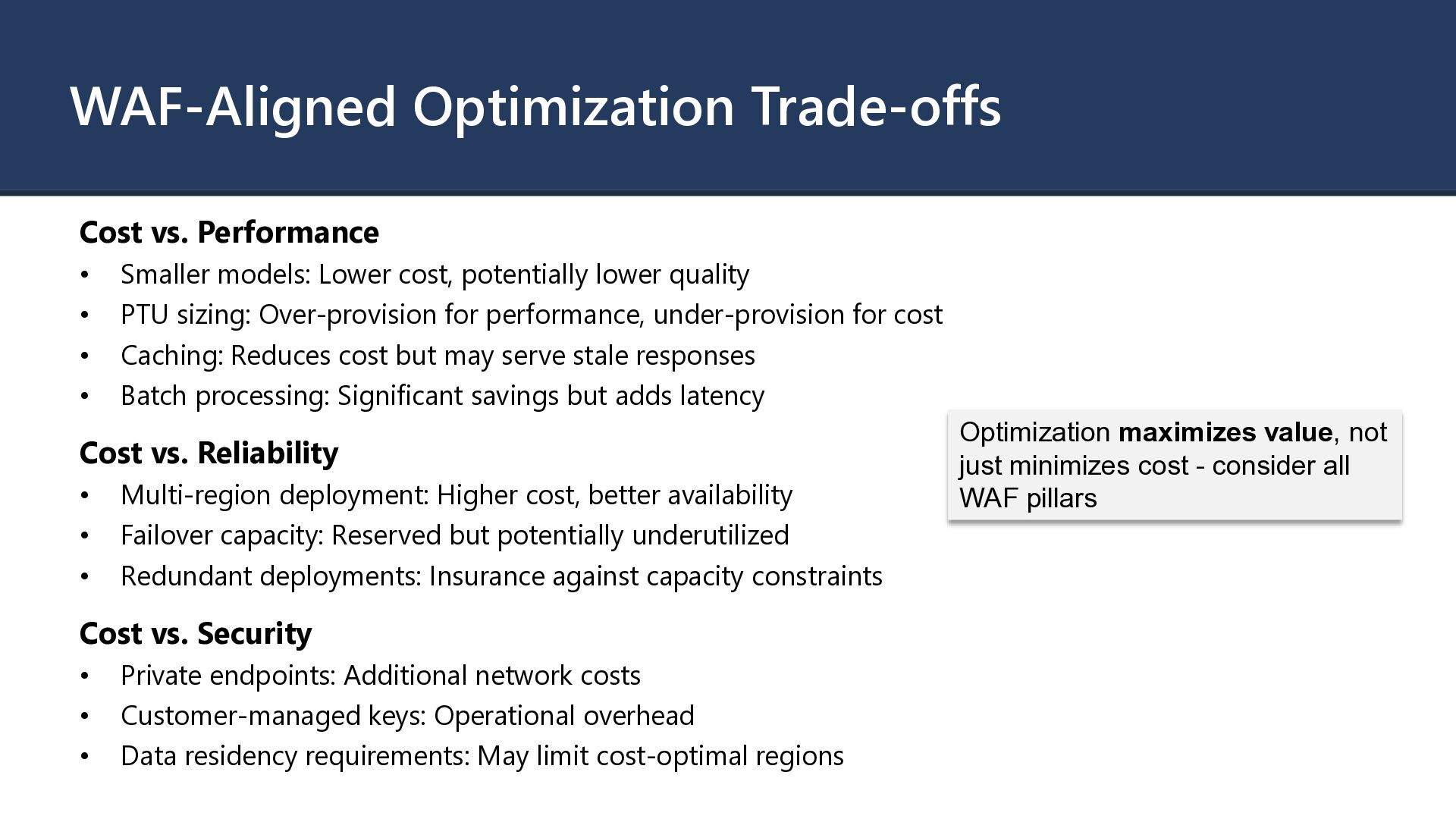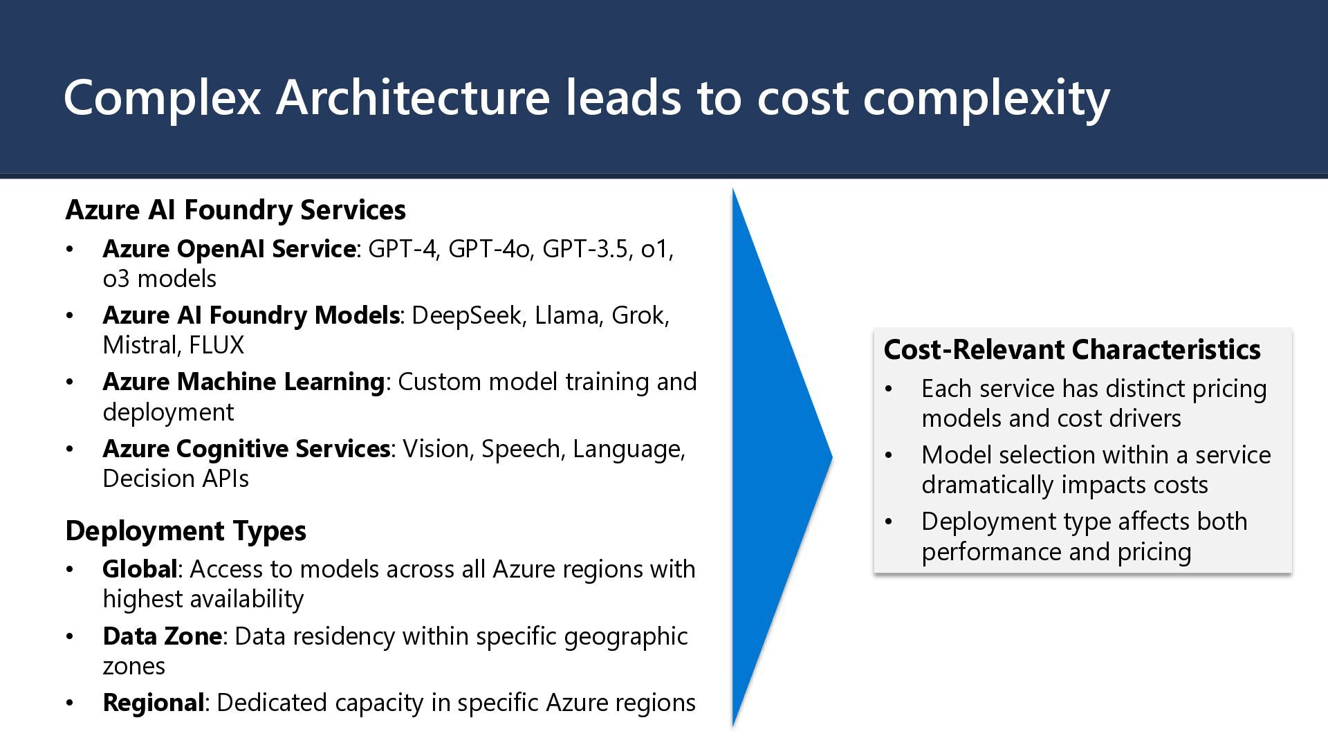 • Azure OpenAI Service: GPT-4, GPT-4o, GPT-3.5, o1, o3 models • Azure AI Foundry Models: DeepSeek, Llama, Grok, Mistral, FLUX • Azure Machine Learning: Custom model training and deployment • Azure Cognitive Services: Vision, Speech, Language, Decision APIs Deployment Types • Global: Access to models across all Azure regions with highest availability • Data Zone: Data residency within specific geographic zones • Regional: Dedicated capacity in specific Azure regions Cost-Relevant Characteristics • Each service has distinct pricing models and cost drivers • Model selection within a service dramatically impacts costs • Deployment type affects both performance and pricing