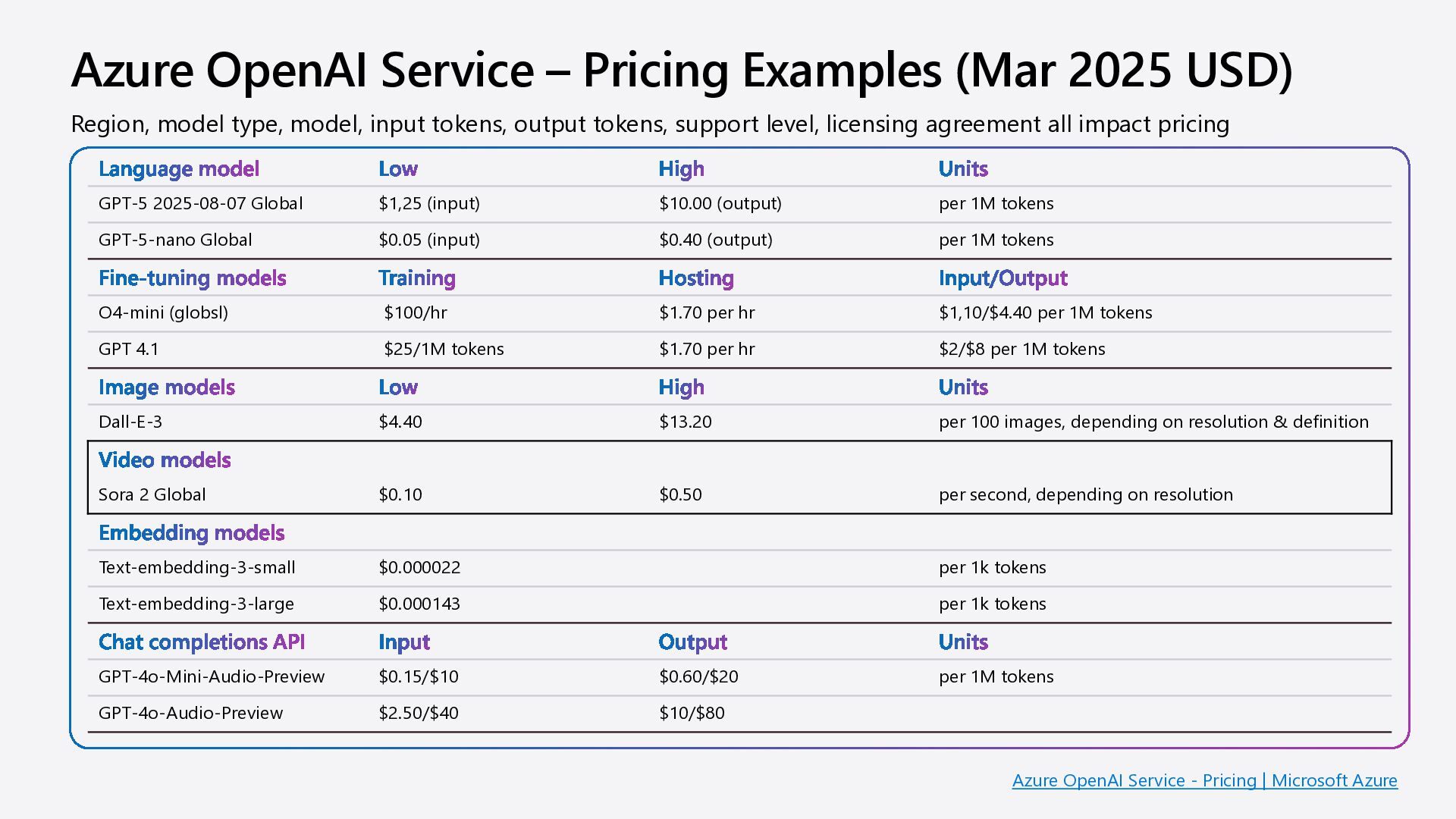 model Low High Units GPT-5 2025-08-07 Global $1,25 (input) $10.00 (output) per 1M tokens GPT-5-nano Global $0.05 (input) $0.40 (output) per 1M tokens Fine-tuning models Training Hosting Input/Output O4-mini (globsl) $100/hr $1.70 per hr $1,10/$4.40 per 1M tokens GPT 4.1 $25/1M tokens $1.70 per hr $2/$8 per 1M tokens Image models Low High Units Dall-E-3 $4.40 $13.20 per 100 images, depending on resolution & definition Video models Sora 2 Global $0.10 $0.50 per second, depending on resolution Embedding models Text-embedding-3-small $0.000022 per 1k tokens Text-embedding-3-large $0.000143 per 1k tokens Chat completions API Input Output Units GPT-4o-Mini-Audio-Preview $0.15/$10 $0.60/$20 per 1M tokens GPT-4o-Audio-Preview $2.50/$40 $10/$80 Region, model type, model, input tokens, output tokens, support level, licensing agreement all impact pricing Azure OpenAI Service - Pricing | Microsoft Azure