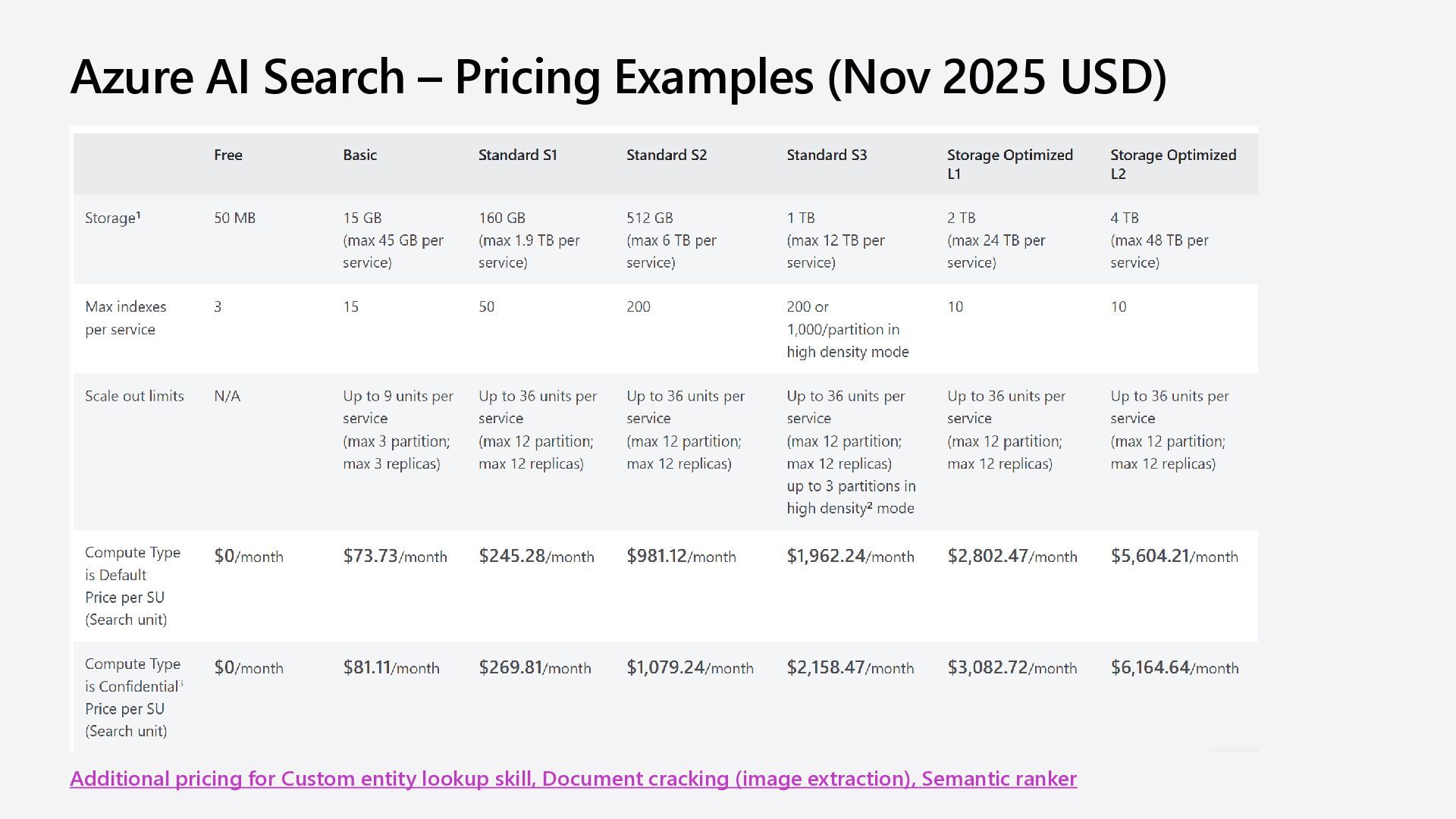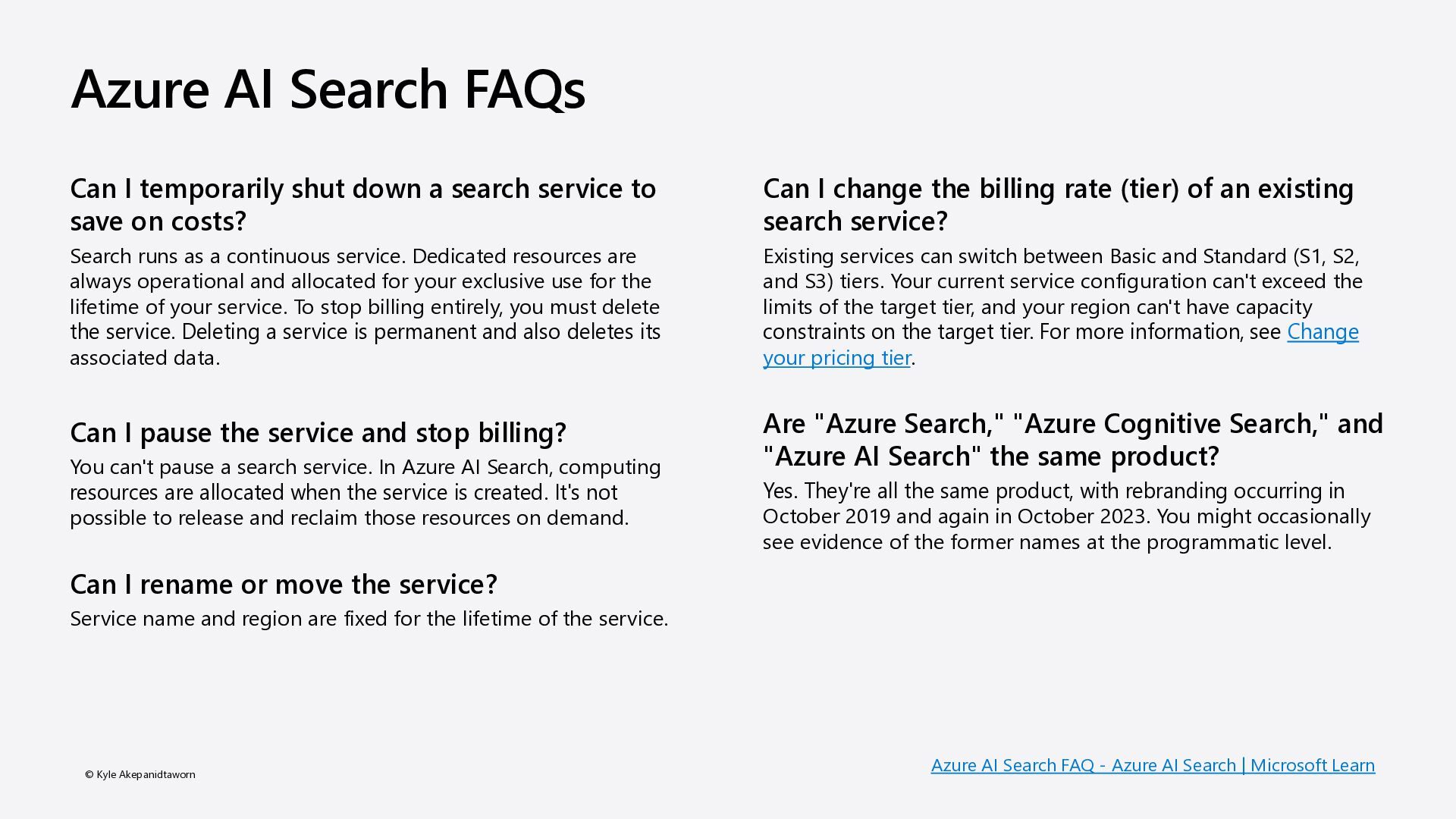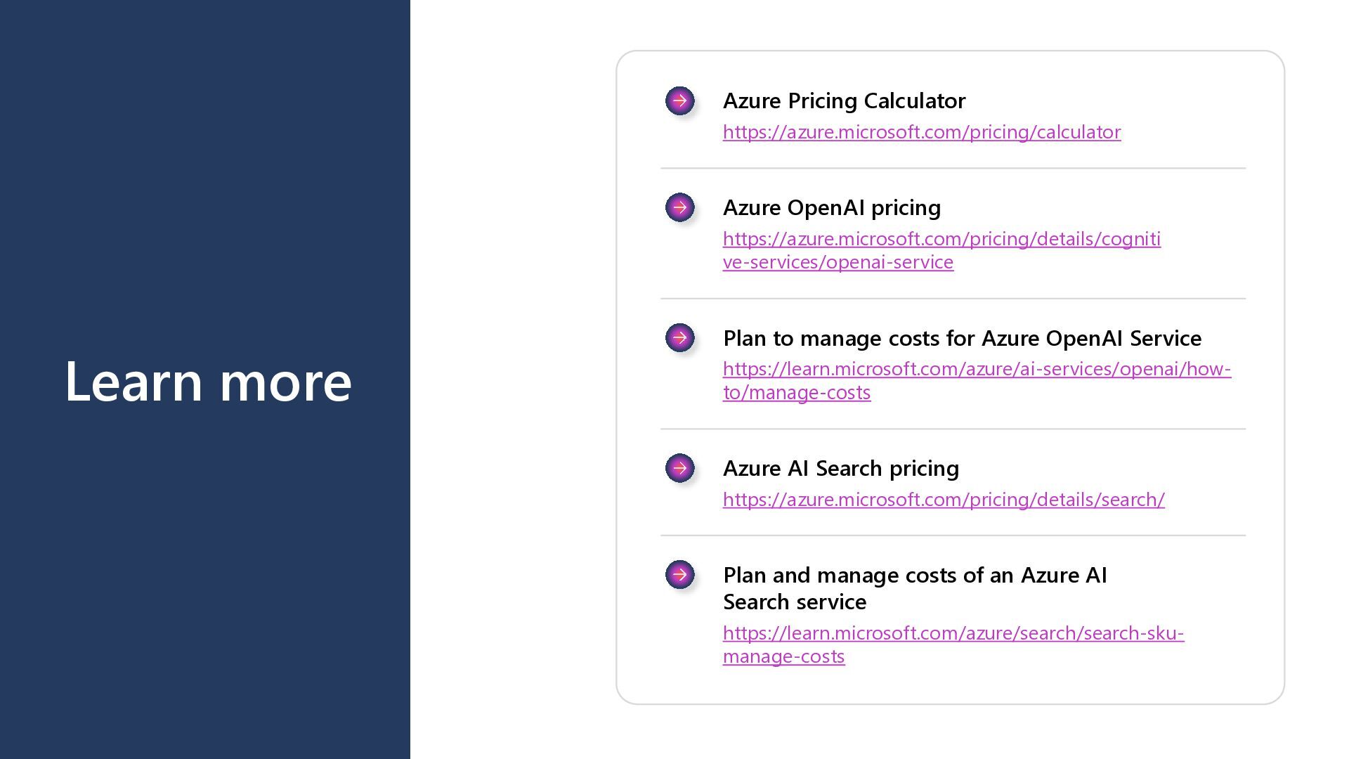 https://azure.microsoft.com/pricing/details/cogniti ve-services/openai-service Plan to manage costs for Azure OpenAI Service https://learn.microsoft.com/azure/ai-services/openai/how- to/manage-costs Azure AI Search pricing https://azure.microsoft.com/pricing/details/search/ Plan and manage costs of an Azure AI Search service https://learn.microsoft.com/azure/search/search-sku- manage-costs