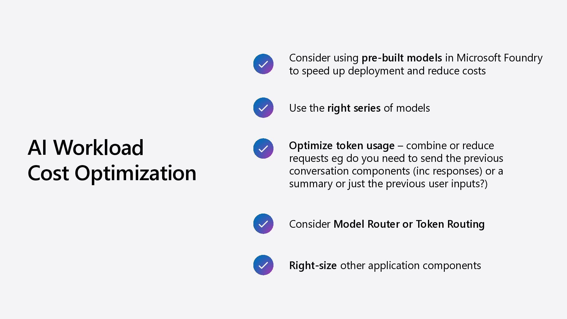 Foundry to speed up deployment and reduce costs Use the right series of models Optimize token usage – combine or reduce requests eg do you need to send the previous conversation components (inc responses) or a summary or just the previous user inputs?) Right-size other application components Consider Model Router or Token Routing