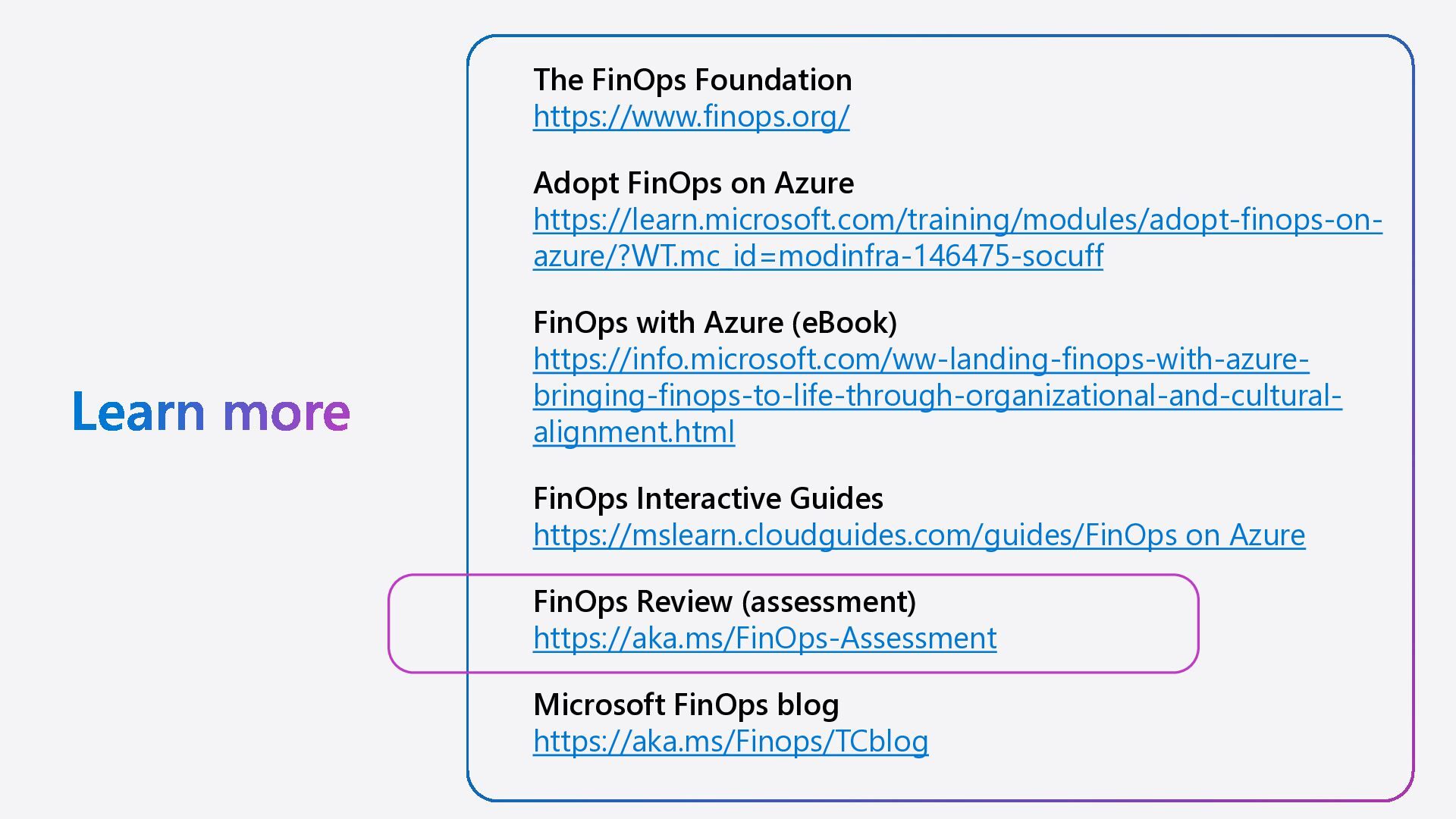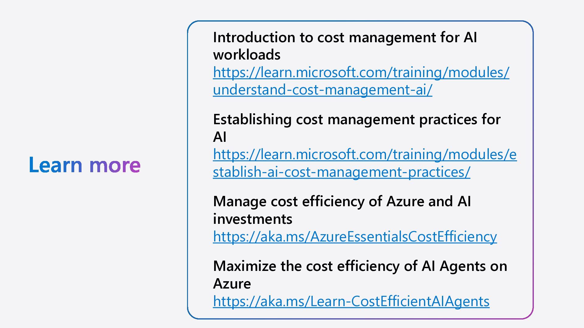 understand-cost-management-ai/ Establishing cost management practices for AI https://learn.microsoft.com/training/modules/e stablish-ai-cost-management-practices/ Manage cost efficiency of Azure and AI investments https://aka.ms/AzureEssentialsCostEfficiency Maximize the cost efficiency of AI Agents on Azure https://aka.ms/Learn-CostEfficientAIAgents