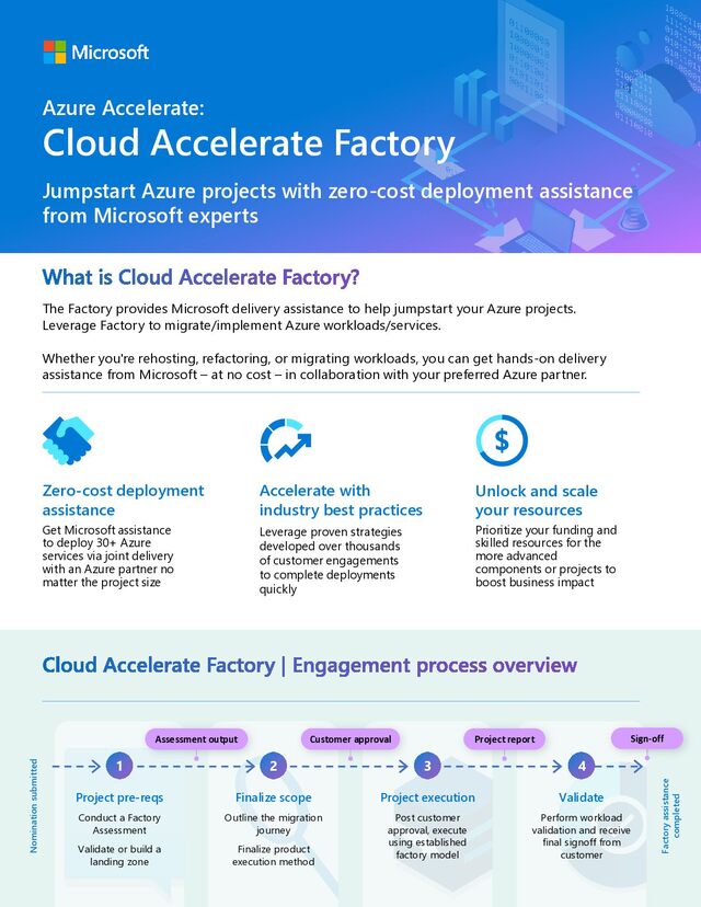The Factory provides Microsoft delivery assistance to help jumpstart your Azure projects. Leverage Factory to migrate/implement Azure workloads/services. Whether you're rehosting, refactoring, or migrating workloads, you can get hands-on delivery assistance from Microsoft – at no cost – in collaboration with your preferred Azure partner. Zero-cost deployment assistance Get Microsoft assistance to deploy 30+ Azure services via joint delivery with an Azure partner no matter the project size Accelerate with industry best practices Leverage proven strategies developed over thousands of customer engagements to complete deployments quickly Unlock and scale your resources Prioritize your funding and skilled resources for the more advanced components or projects to boost business impact Cloud Accelerate Factory | Engagement process overview Jumpstart Azure projects with zero-cost deployment assistance from Microsoft experts Project pre-reqs Conduct a Factory Assessment Validate or build a landing zone Finalize scope Outline the migration journey Finalize product execution method Project execution Post customer approval, execute using established factory model 1 2 3 4 Assessment output Customer approval Project report Validate Perform workload validation and receive final signoff from customer Nomination submitted Factory assistance completed Sign-off