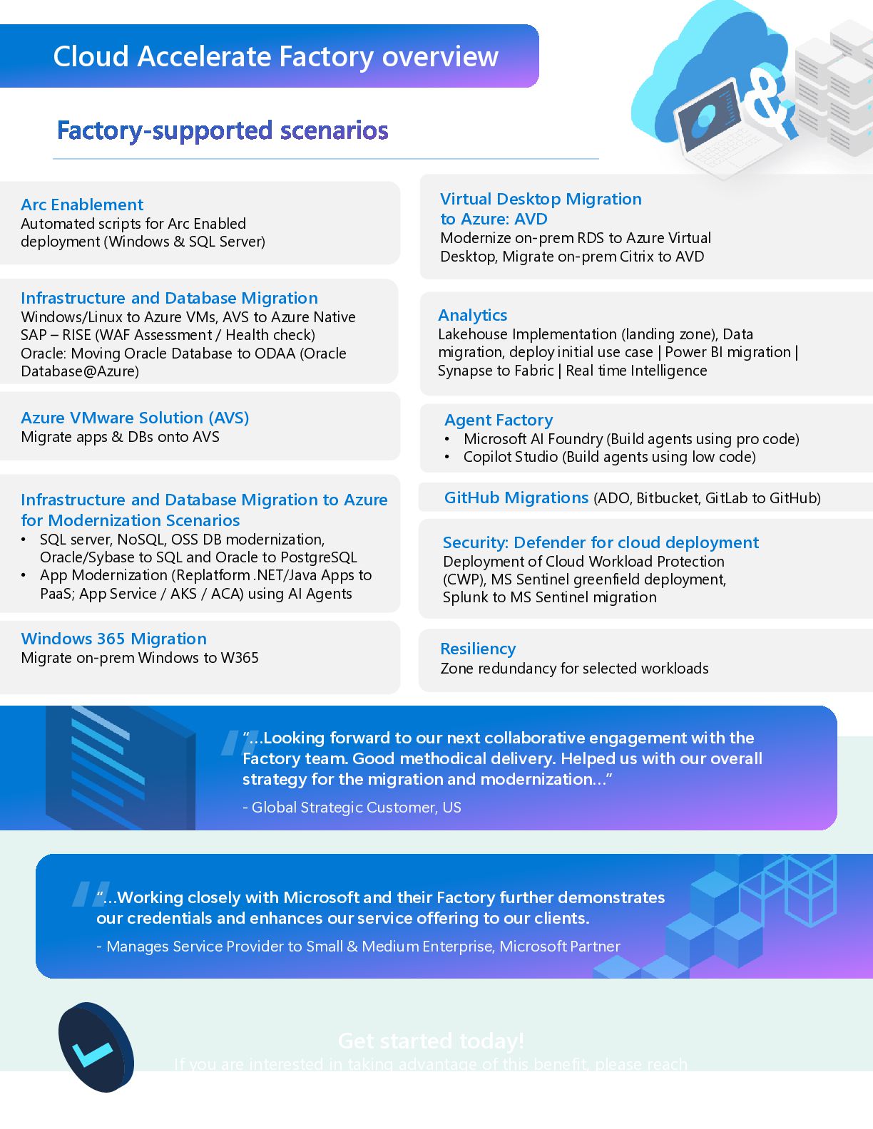 you are interested in taking advantage of this benefit, please reach out to your Microsoft account team or Azure partner. “…Looking forward to our next collaborative engagement with the Factory team. Good methodical delivery. Helped us with our overall strategy for the migration and modernization…” - Global Strategic Customer, US “…Working closely with Microsoft and their Factory further demonstrates our credentials and enhances our service offering to our clients. - Manages Service Provider to Small & Medium Enterprise, Microsoft Partner Arc Enablement Automated scripts for Arc Enabled deployment (Windows & SQL Server) Infrastructure and Database Migration Windows/Linux to Azure VMs, AVS to Azure Native SAP – RISE (WAF Assessment / Health check) Oracle: Moving Oracle Database to ODAA (Oracle Database@Azure) Azure VMware Solution (AVS) Migrate apps & DBs onto AVS Infrastructure and Database Migration to Azure for Modernization Scenarios • SQL server, NoSQL, OSS DB modernization, Oracle/Sybase to SQL and Oracle to PostgreSQL • App Modernization (Replatform .NET/Java Apps to PaaS; App Service / AKS / ACA) using AI Agents Virtual Desktop Migration to Azure: AVD Modernize on-prem RDS to Azure Virtual Desktop, Migrate on-prem Citrix to AVD Analytics Lakehouse Implementation (landing zone), Data migration, deploy initial use case | Power BI migration | Synapse to Fabric | Real time Intelligence Agent Factory • Microsoft AI Foundry (Build agents using pro code) • Copilot Studio (Build agents using low code) Security: Defender for cloud deployment Deployment of Cloud Workload Protection (CWP), MS Sentinel greenfield deployment, Splunk to MS Sentinel migration Windows 365 Migration Migrate on-prem Windows to W365 Resiliency Zone redundancy for selected workloads GitHub Migrations (ADO, Bitbucket, GitLab to GitHub)