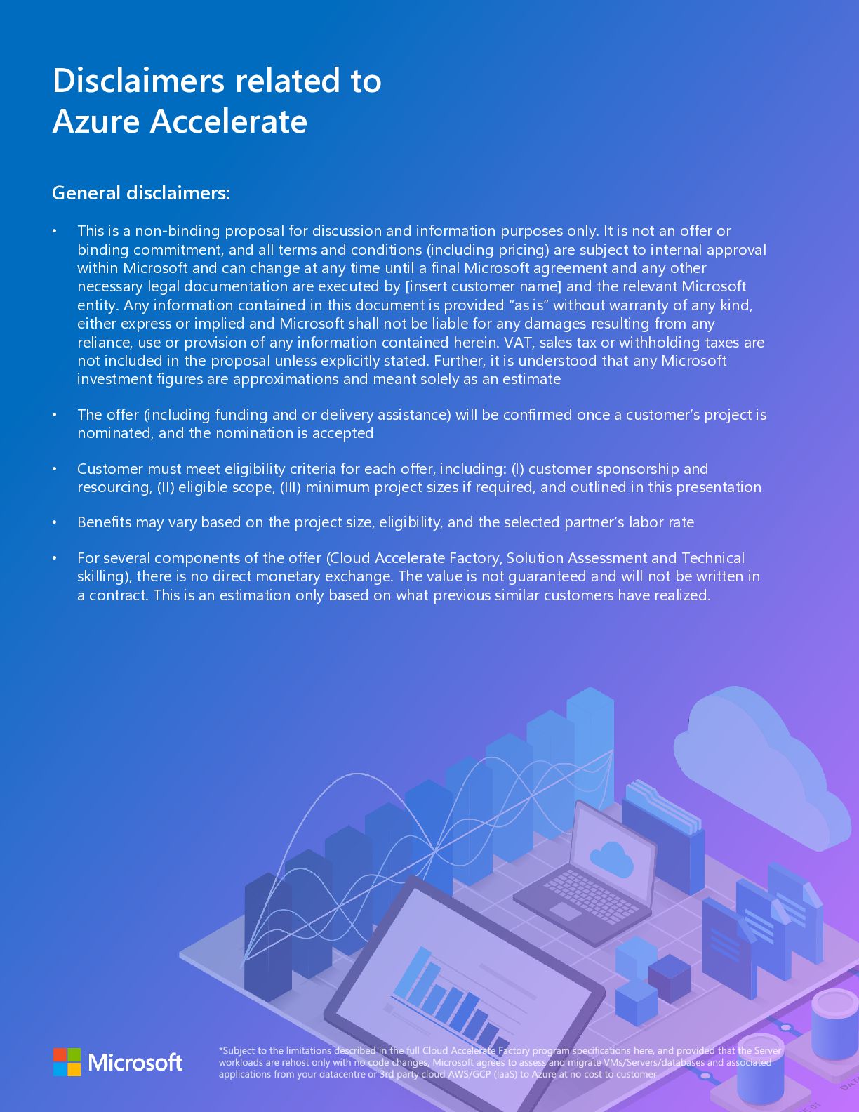 a non-binding proposal for discussion and information purposes only. It is not an offer or binding commitment, and all terms and conditions (including pricing) are subject to internal approval within Microsoft and can change at any time until a final Microsoft agreement and any other necessary legal documentation are executed by [insert customer name] and the relevant Microsoft entity. Any information contained in this document is provided “as is” without warranty of any kind, either express or implied and Microsoft shall not be liable for any damages resulting from any reliance, use or provision of any information contained herein. VAT, sales tax or withholding taxes are not included in the proposal unless explicitly stated. Further, it is understood that any Microsoft investment figures are approximations and meant solely as an estimate • The offer (including funding and or delivery assistance) will be confirmed once a customer’s project is nominated, and the nomination is accepted • Customer must meet eligibility criteria for each offer, including: (I) customer sponsorship and resourcing, (II) eligible scope, (III) minimum project sizes if required, and outlined in this presentation • Benefits may vary based on the project size, eligibility, and the selected partner’s labor rate • For several components of the offer (Cloud Accelerate Factory, Solution Assessment and Technical skilling), there is no direct monetary exchange. The value is not guaranteed and will not be written in a contract. This is an estimation only based on what previous similar customers have realized.