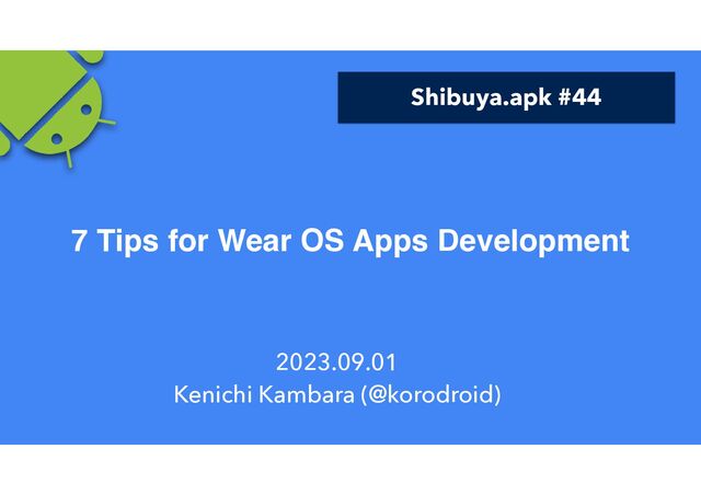 This is a slide, "7 Tips for Wear OS Apps Development" on Shibuya.apk 44. #shibuya_apk #wearos #androiddev #androidjp