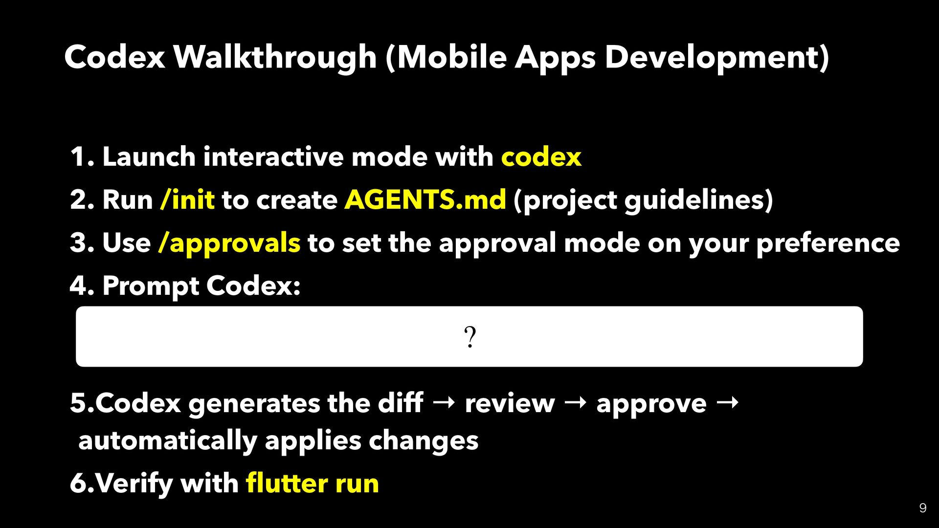with codex 2. Run /init to create AGENTS.md (project guidelines) 3. Use /approvals to set the approval mode on your preference 4. Prompt Codex: 5.Codex generates the diff → review → approve → automatically applies changes 6.Verify with fl utter run ?