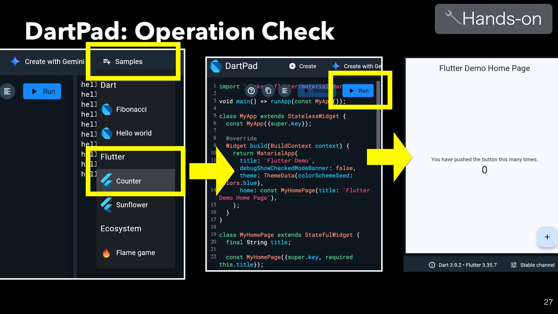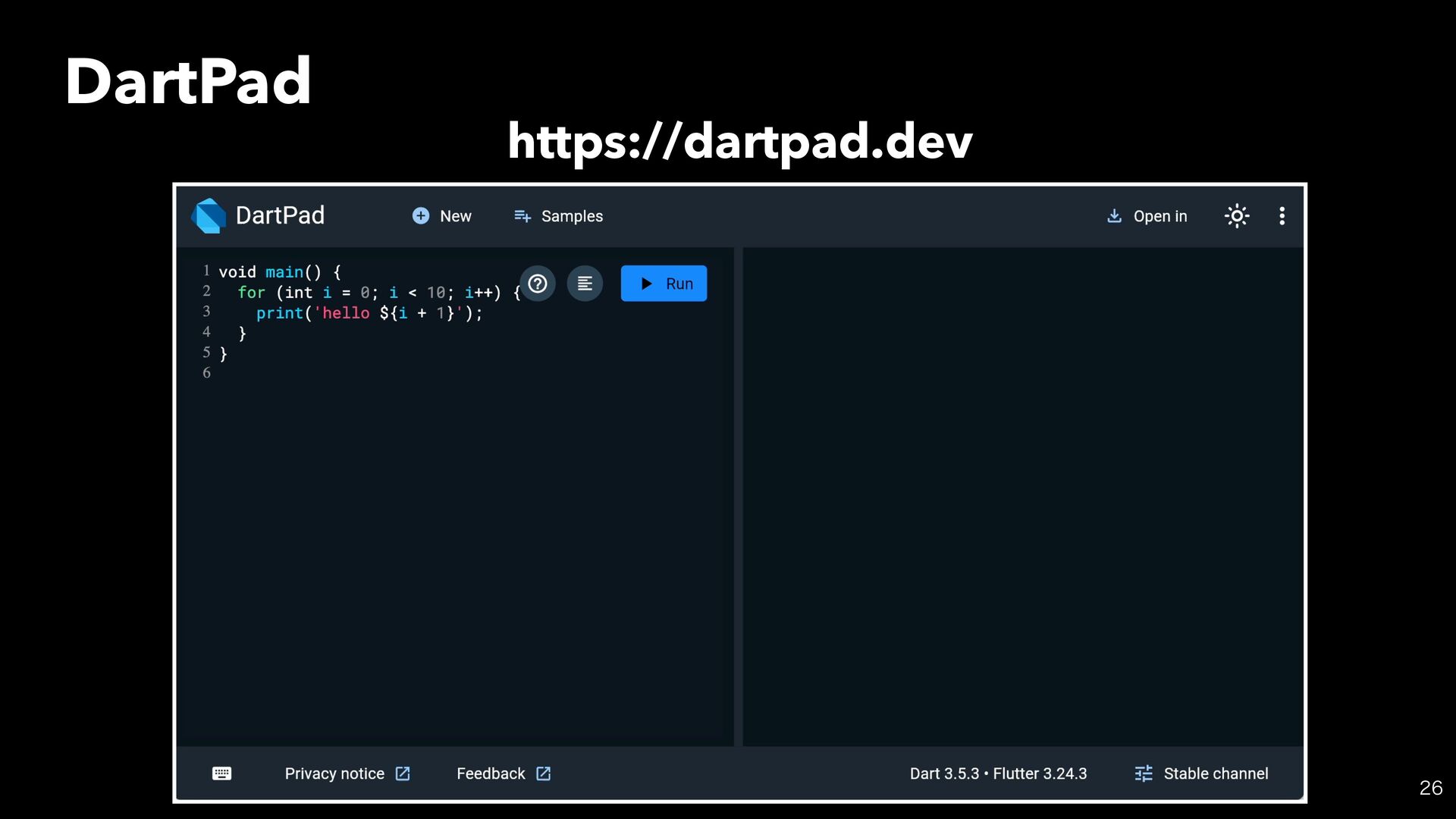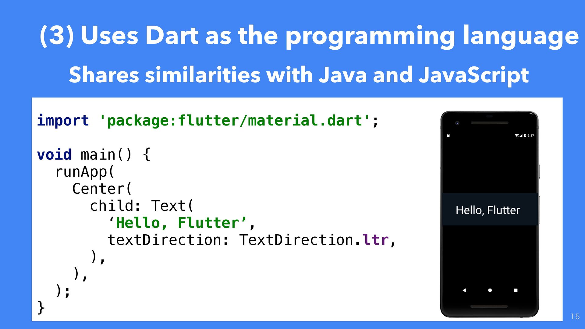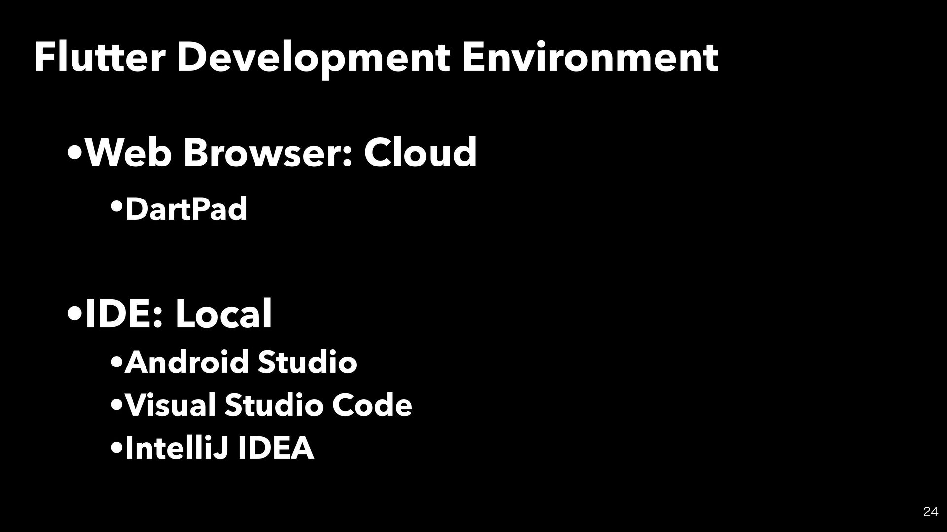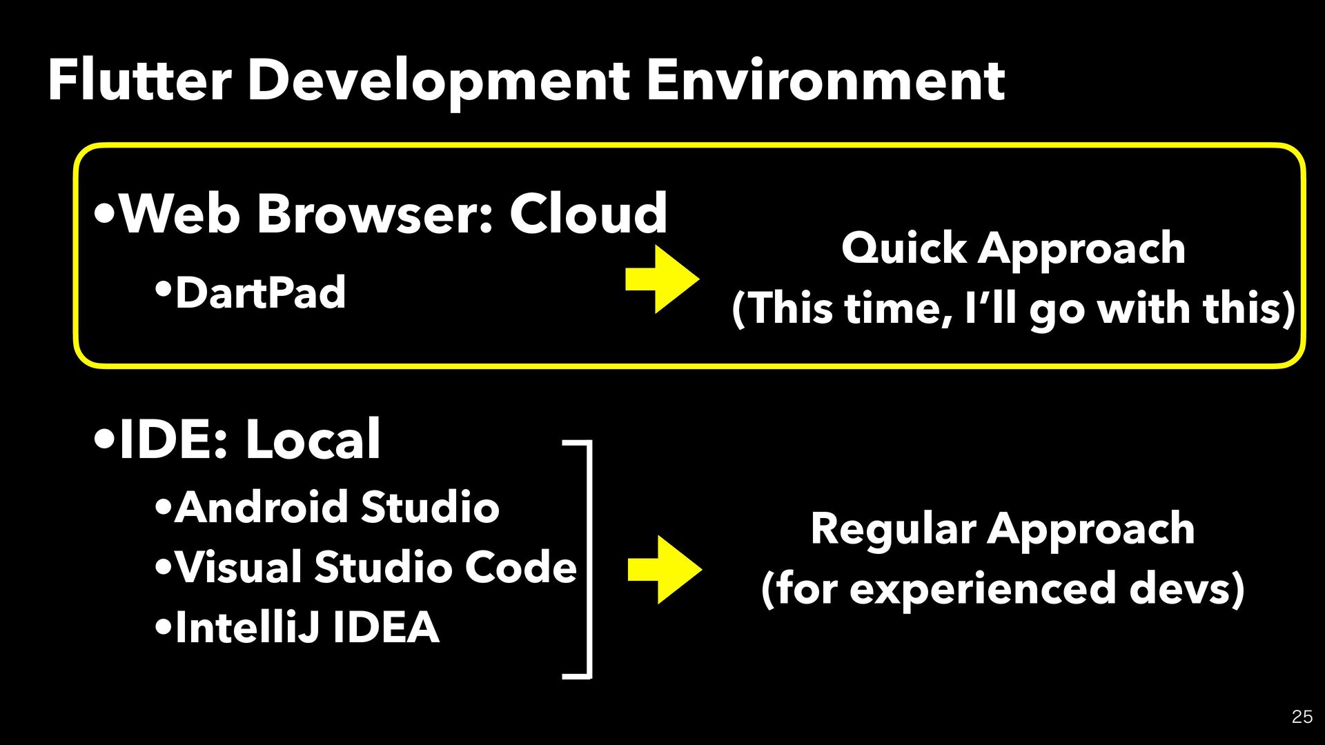 Browser: Cloud •DartPad •IDE: Local •Android Studio •Visual Studio Code •IntelliJ IDEA Regular Approach (for experienced devs) Flutter Development Environment