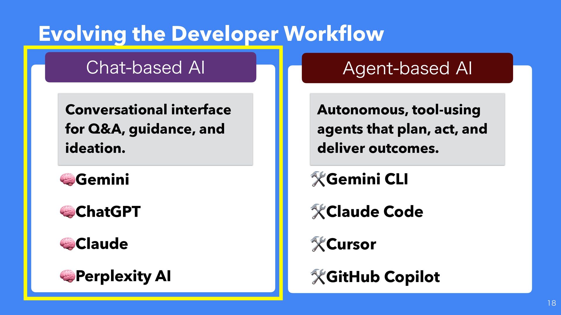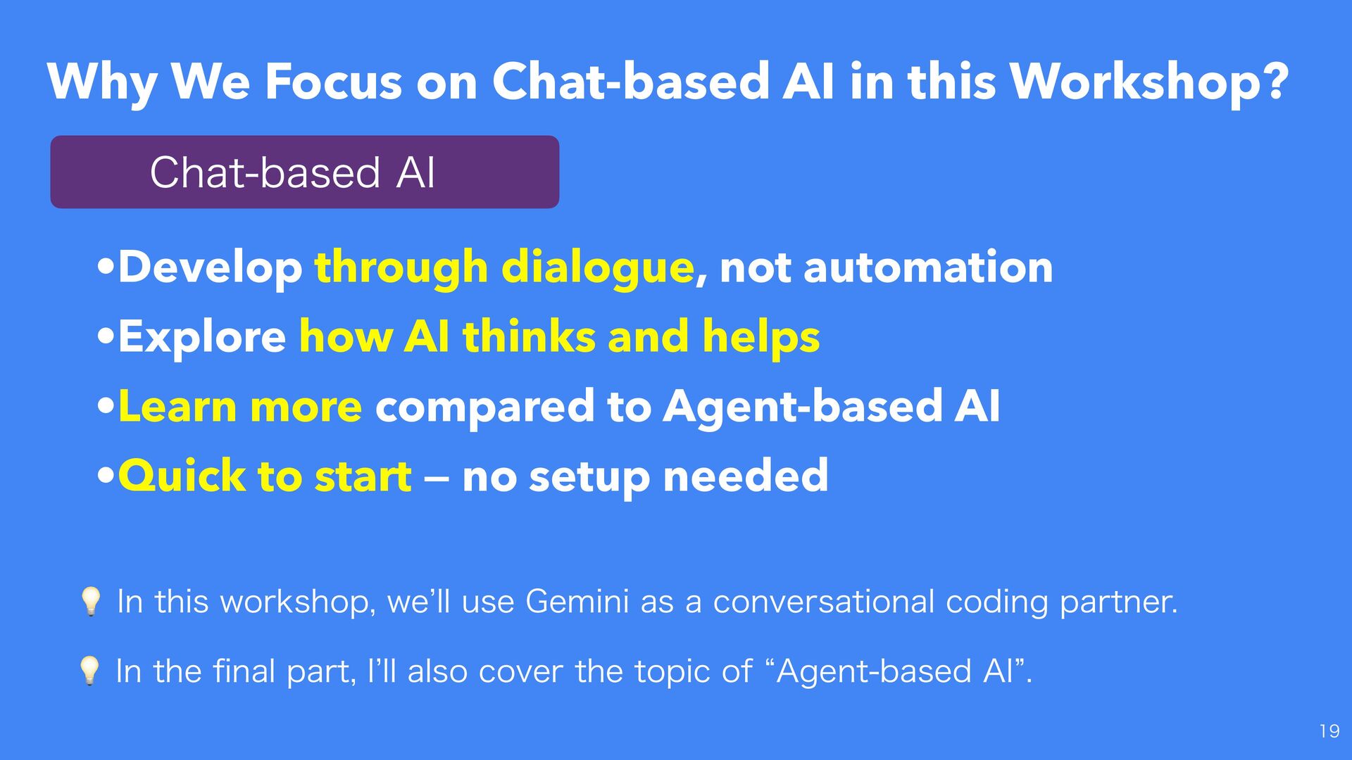 •Develop through dialogue, not automation •Explore how AI thinks and helps •Learn more compared to Agent-based AI •Quick to start — no setup needed $IBUCBTFE"* 💡*OUIJTXPSLTIPQ XF`MMVTF(FNJOJBTBDPOWFSTBUJPOBMDPEJOHQBSUOFS 💡*OUIF fi OBMQBSU *`MMBMTPDPWFSUIFUPQJDPGl"HFOUCBTFE"*z