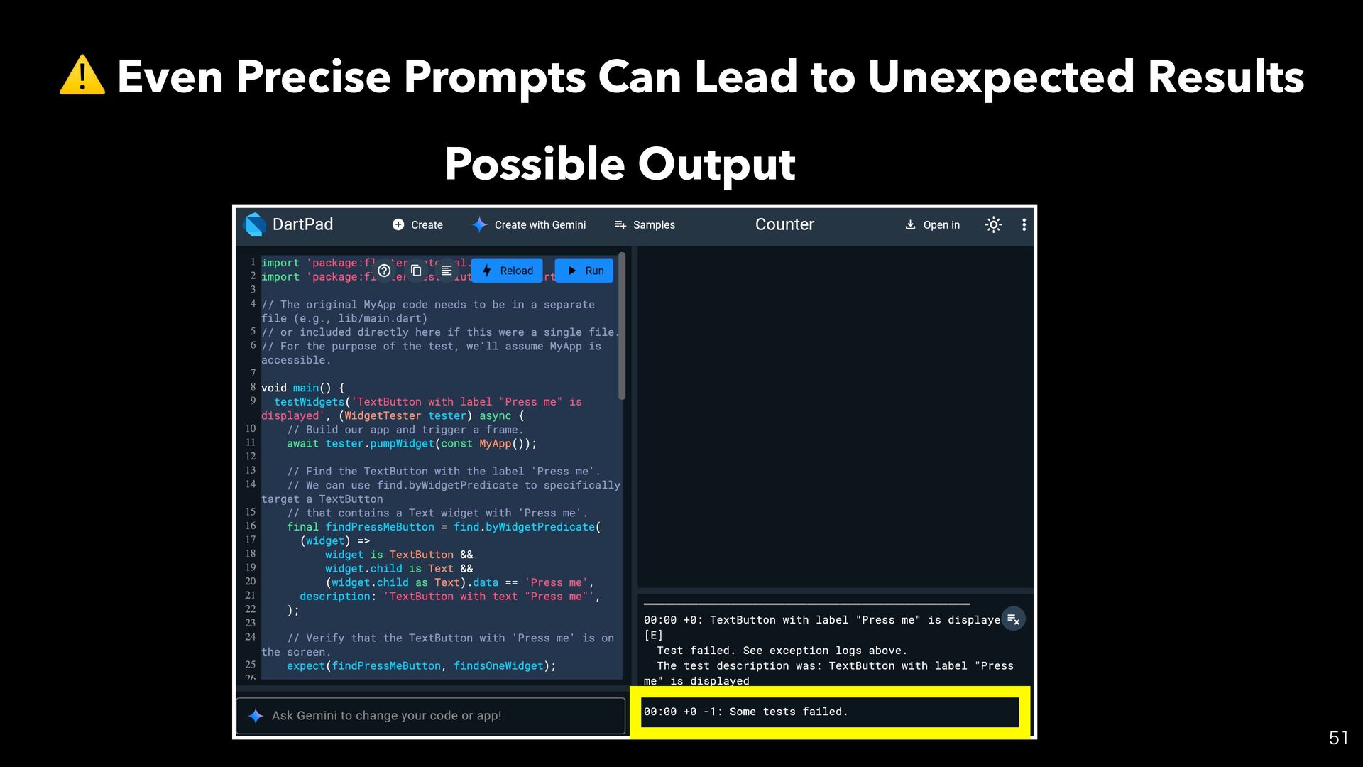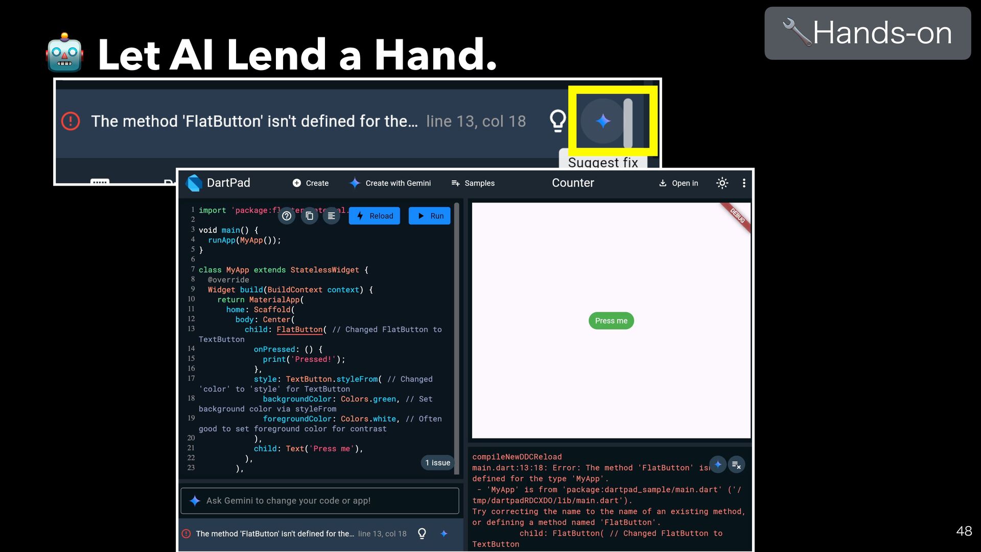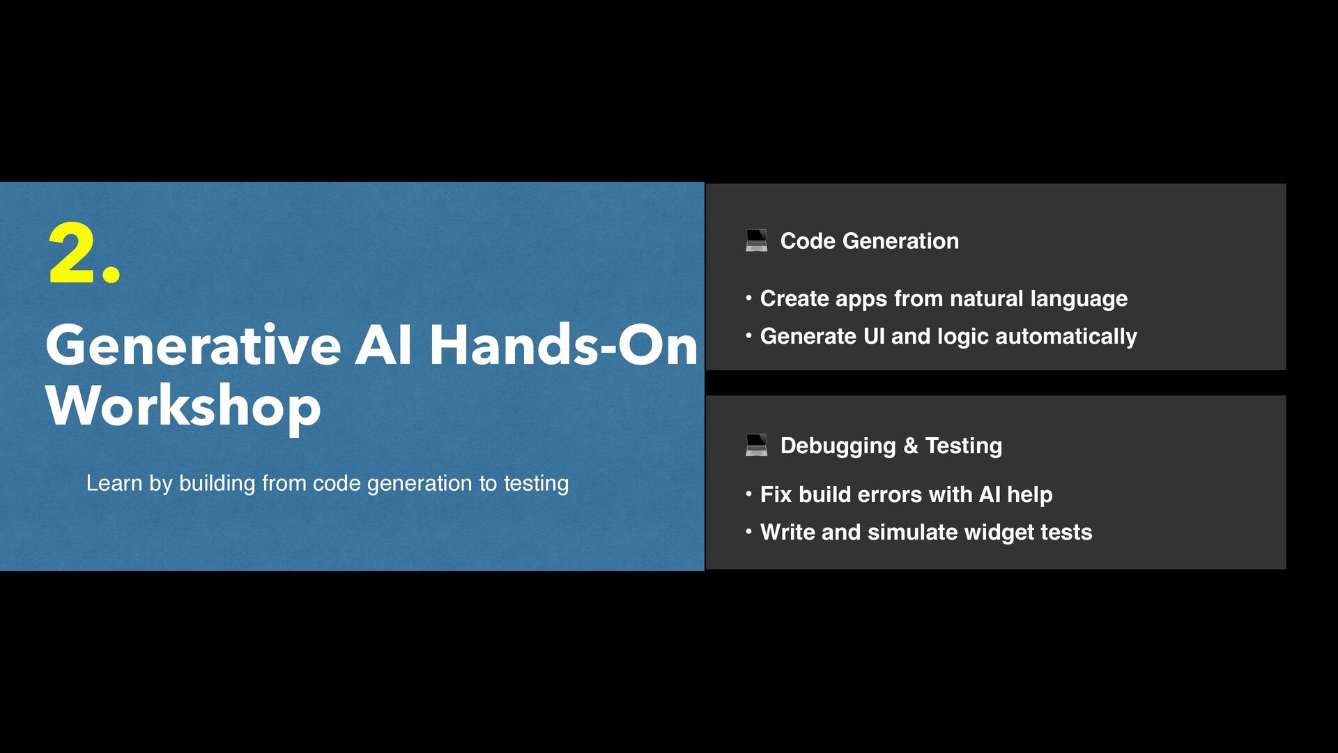 ɾGenerate UI and logic automatically Learn by building from code generation to testing ɾFix build errors with AI help ɾWrite and simulate widget tests 💻 Code Generation 💻 Debugging & Testing